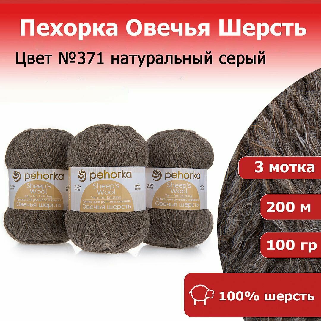Пряжа для вязания Пехорка 'Овечья шерсть', 100г, 200м (100% шерсть) (371 Натуральный серый), 10 мотков