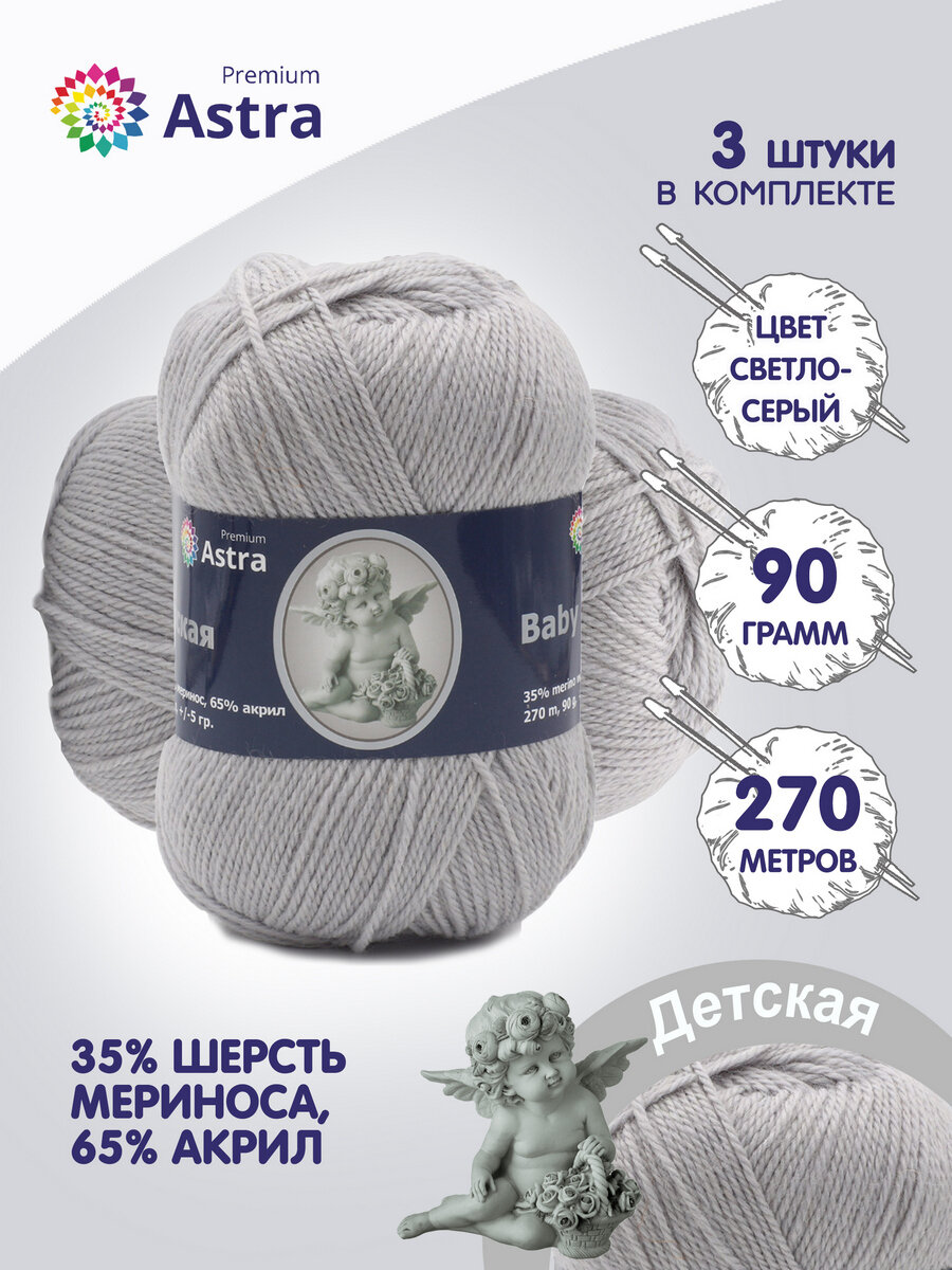 СохранитьПряжа для вязания Astra Premium 'Детская', 90г, 270м (35% шерсть меринос, 65% акрил) (168 светло-серый), 3 мотка интересное: