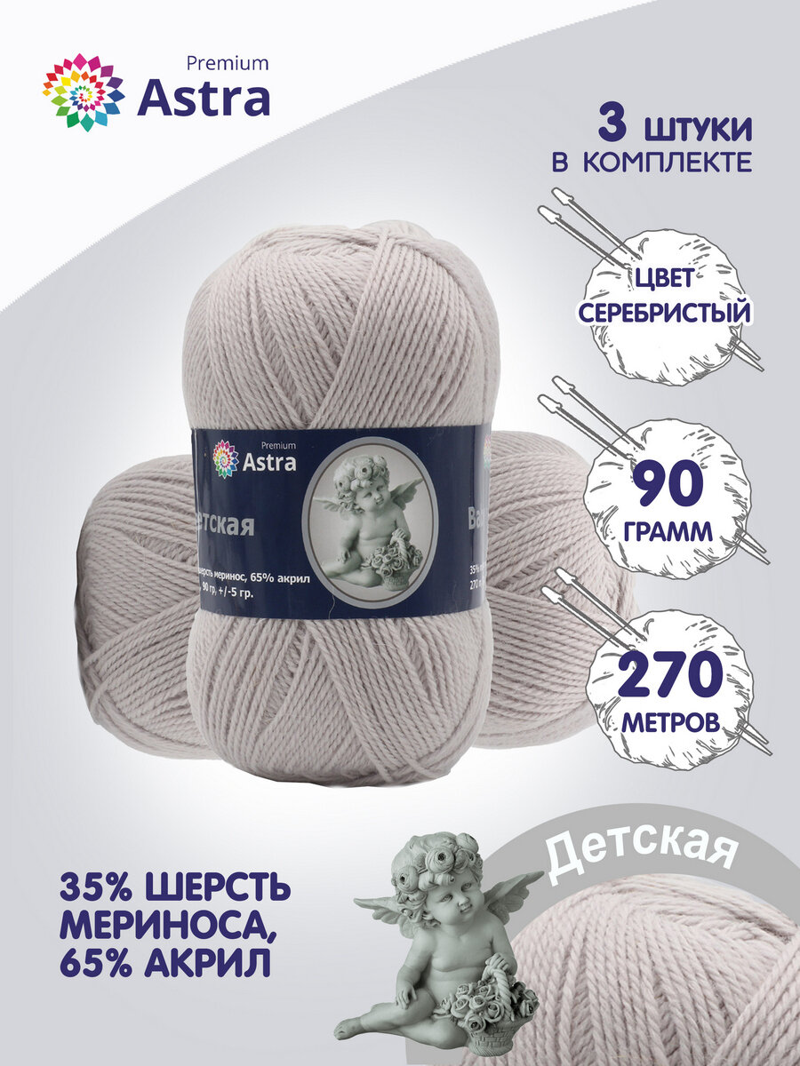 СохранитьПряжа для вязания Astra Premium 'Детская', 90г, 270м (35% шерсть меринос, 65% акрил) (008 серебристый), 3 мотка интересное: