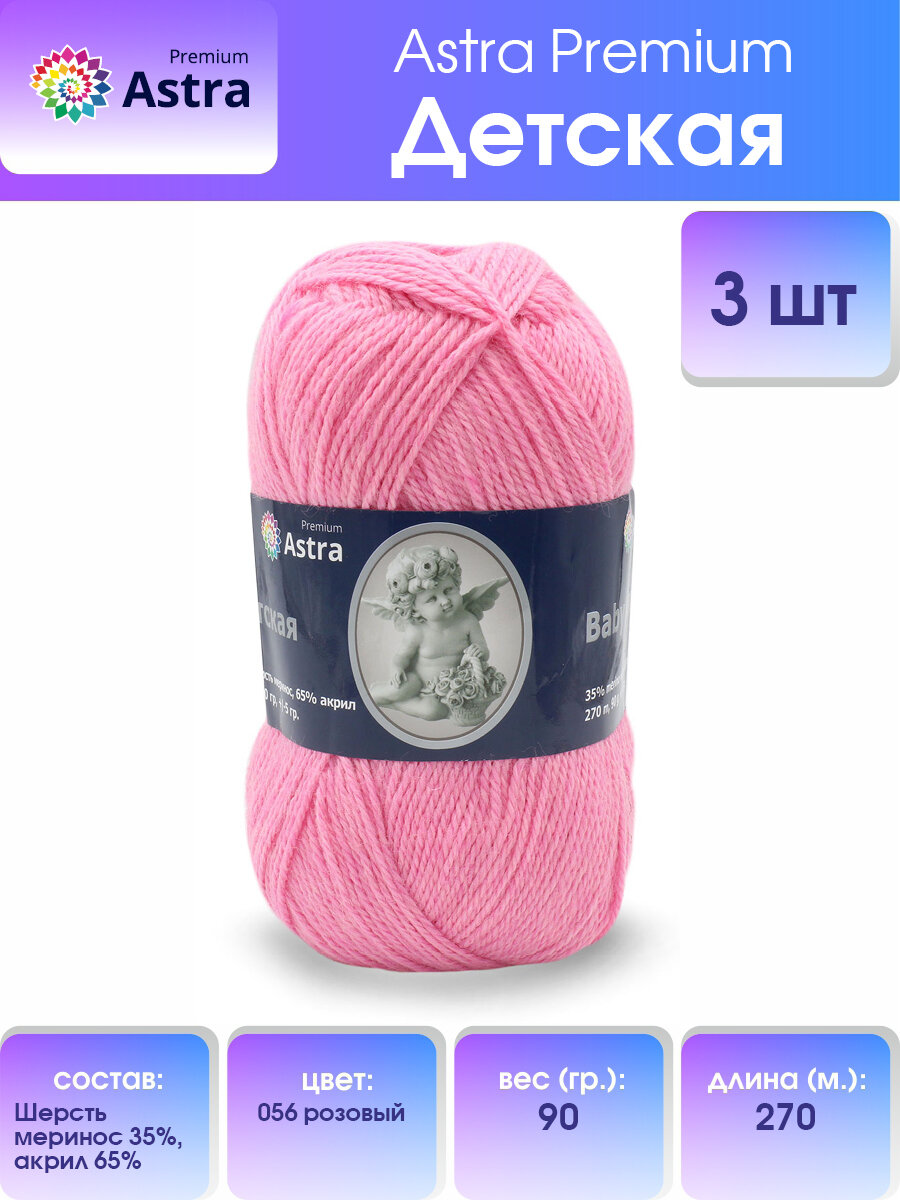 Купить Пряжа для вязания Astra Premium 'Детская', 90г, 270м (35% шерсть меринос, 65% акрил) (056 розовый), 3 мотка