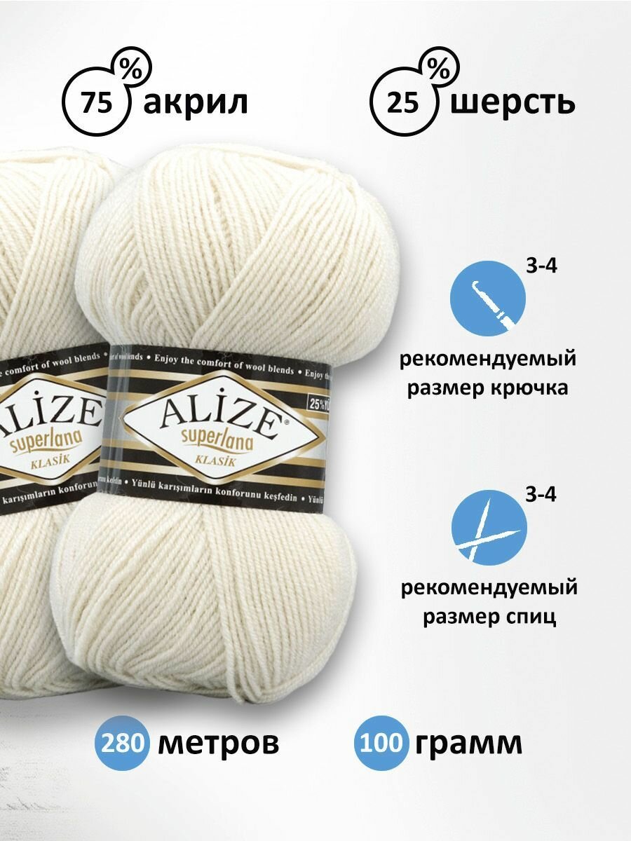 Купить Пряжа для вязания ALIZE 'Superlana klasik' (однотонная), 100г, 280м (75% акрил, 25% шерсть), ТУ (599 слоновая кость), 5 мотков