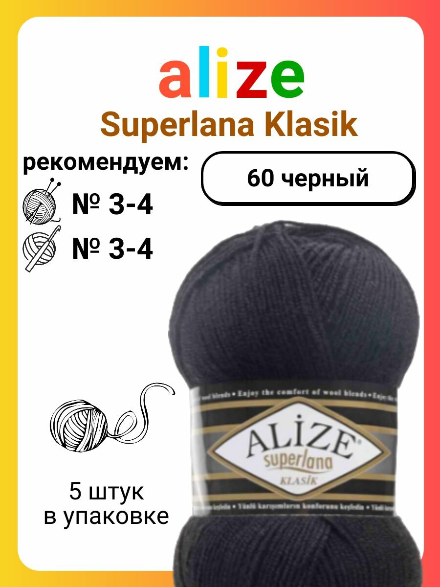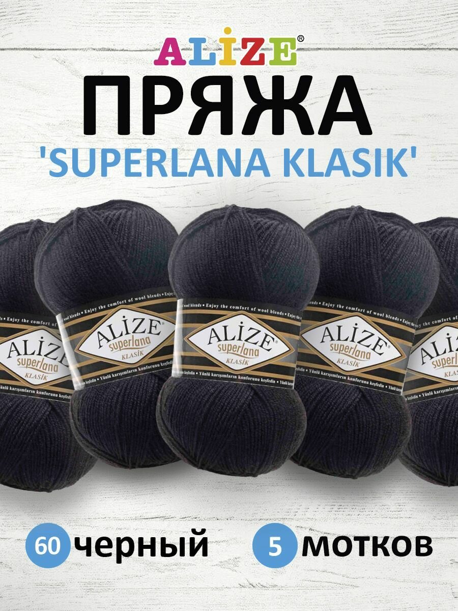 Купить Пряжа Alize Superlana klasik черный (60), 25%шерсть/75%акрил, 280м, 100г, 5шт