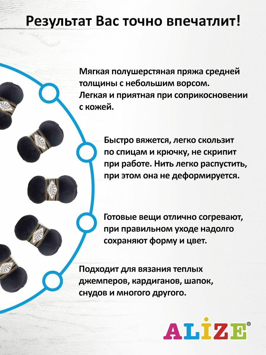СохранитьПряжа Alize Superlana klasik черный (60), 25%шерсть/75%акрил, 280м, 100г, 5шт интересное: