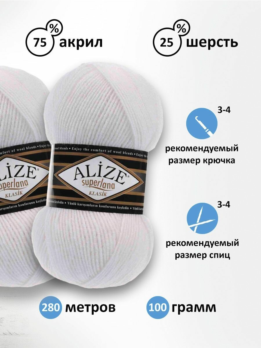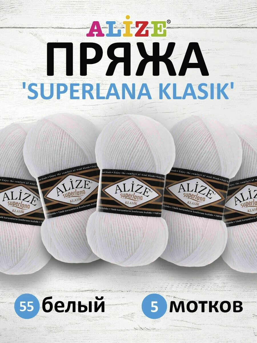 Купить Пряжа для вязания ALIZE 'Superlana klasik' (однотонная), 100г, 280м (75% акрил, 25% шерсть), ТУ (55 белый), 5 мотков