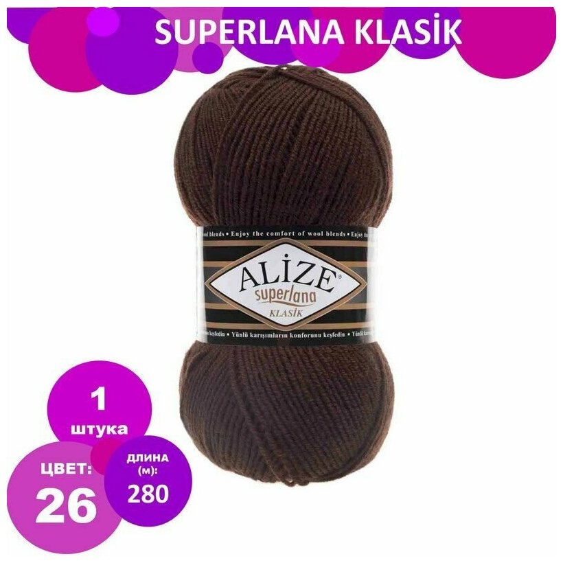 Купить Пряжа Alize Superlana klasik коричневый (26), 25%шерсть/75%акрил, 280м, 100г, 1шт