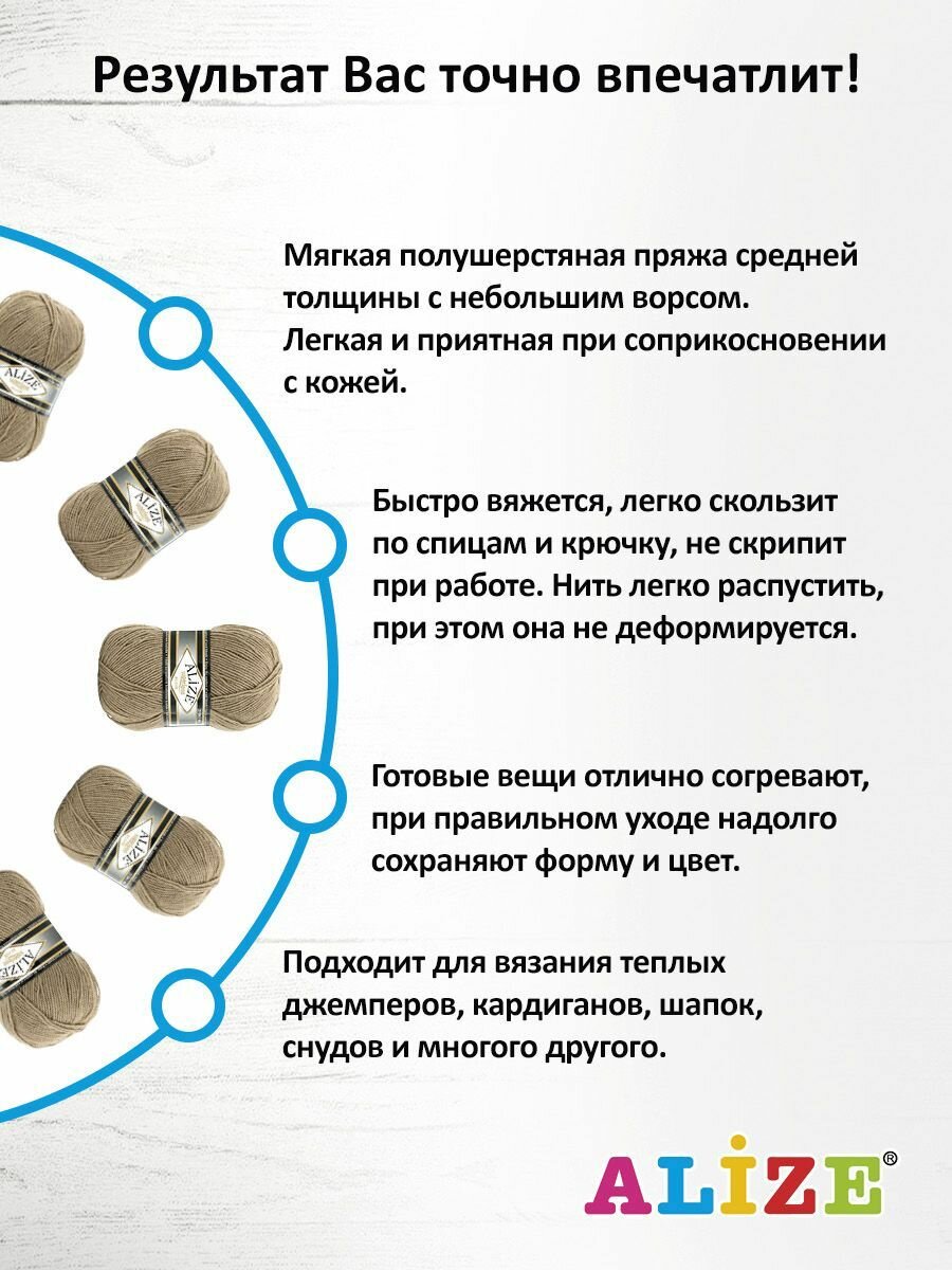 Пряжа Alize Superlana klasik (Ализе Суперлана Классик) - 2 мотка 466 темно-бежевый 25% шерсть, 75% акрил 100г/280м