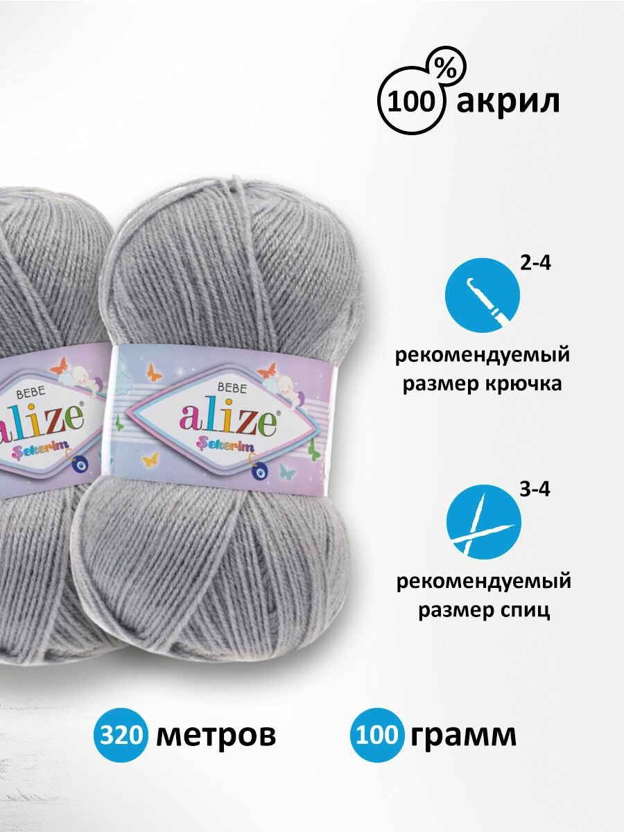 Пряжа для вязания Alize Sekerim Bebe (Шекерим Беби) - 5 мотков 21 серый меланж, детская гипоаллергенная, 100% акрил, 320м/100г