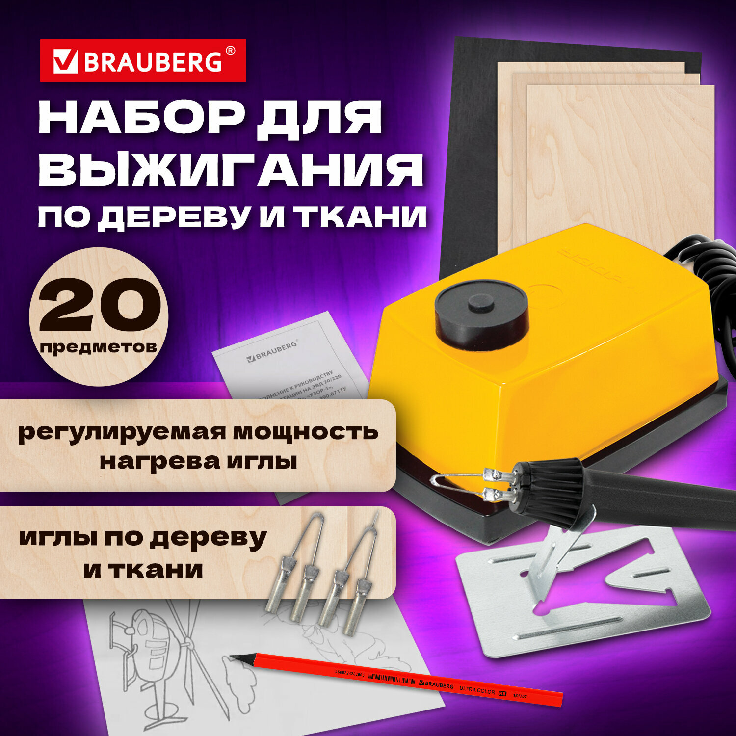 Прибор для выжигания по дереву Узор-1 + 3 дощечки, копирка, карандаш в подарок, Brauberg, 881030 интересное: