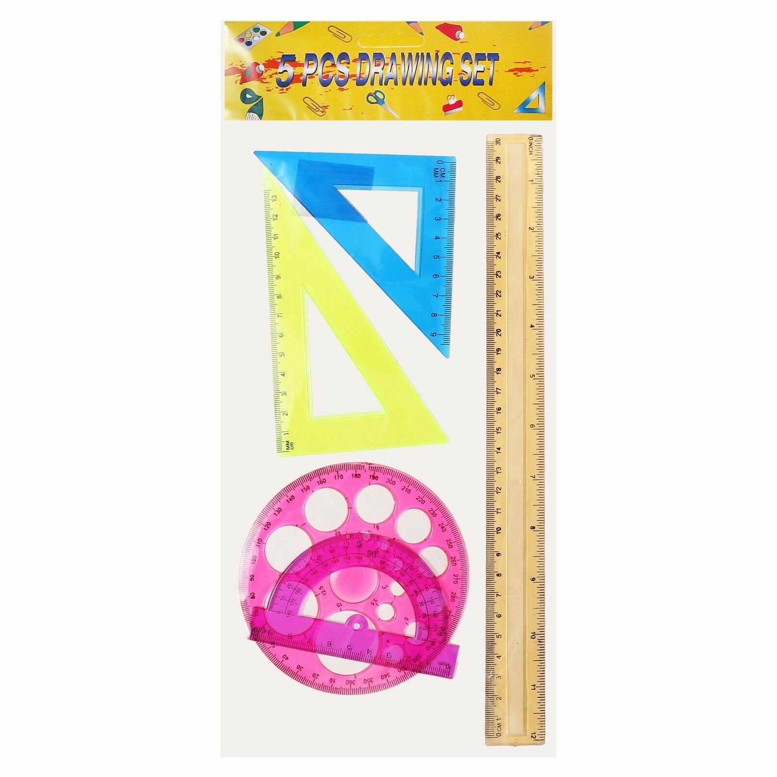 Купить Набор геометрический (линейка-30см+2 угольника+транспортир+трафарет окружности) микс 540590