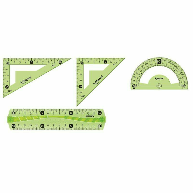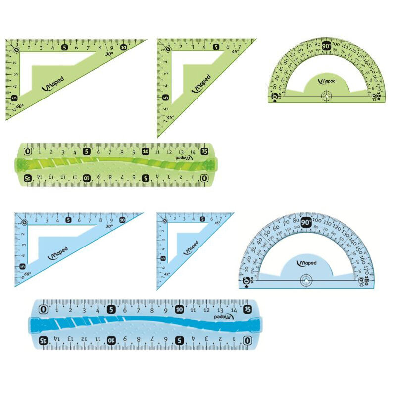 | Комплектация | линейка 15 см / угольник 60° 12 см / угольник 45° 12 см / транспортир 180° 10 см |
