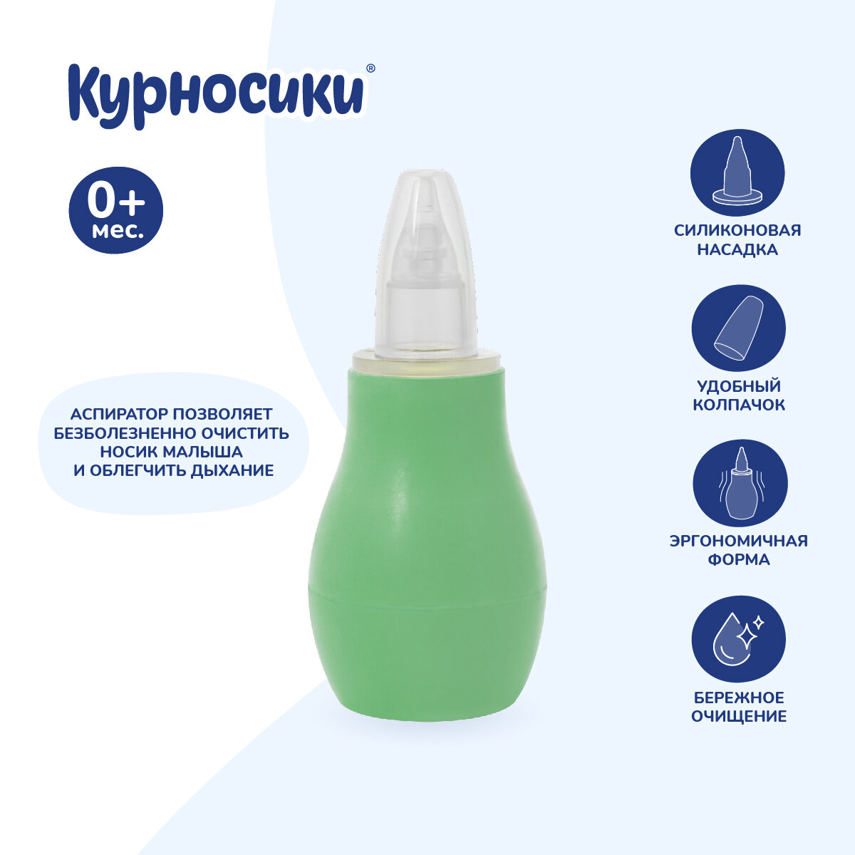 Аспиратор назальный детский Курносики, с мягкой насадкой и защитным колпачком, зеленый