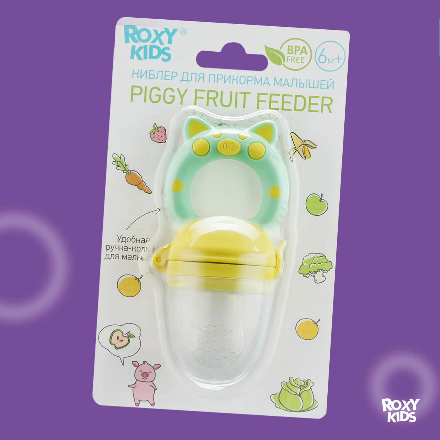 Ниблер для прикорма с силиконовой сеточкой Piggy, мятно-желтый. интересное: