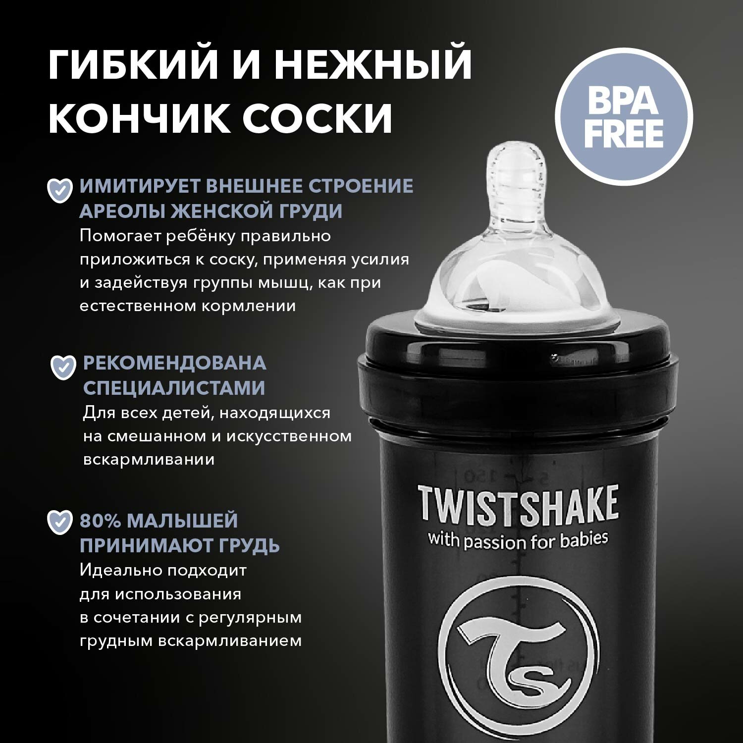 Детская антиколиковая бутылочка Twistshake для кормления, чёрная, 180 мл, от 0 мес, подарок 2 пустышки