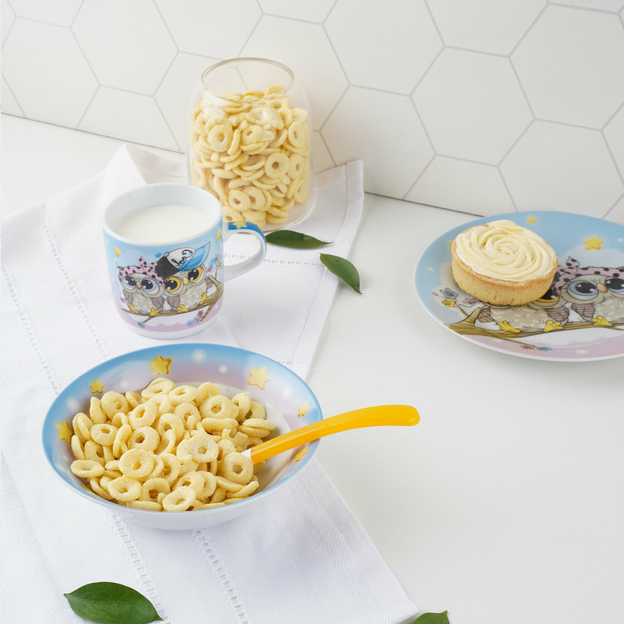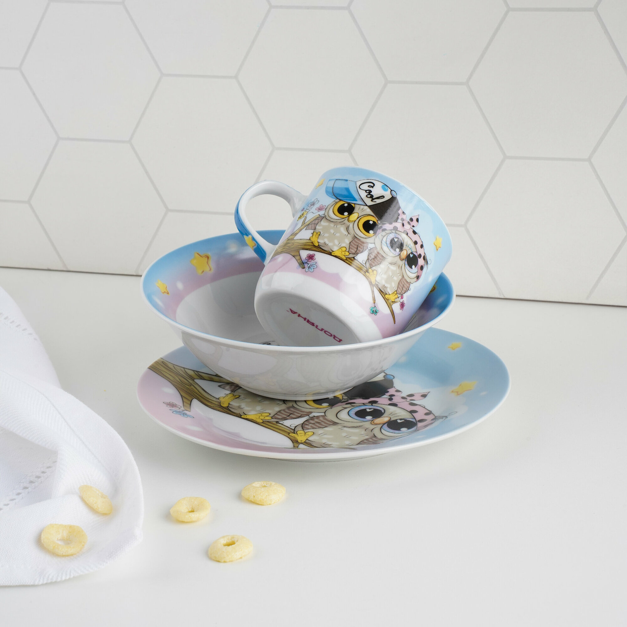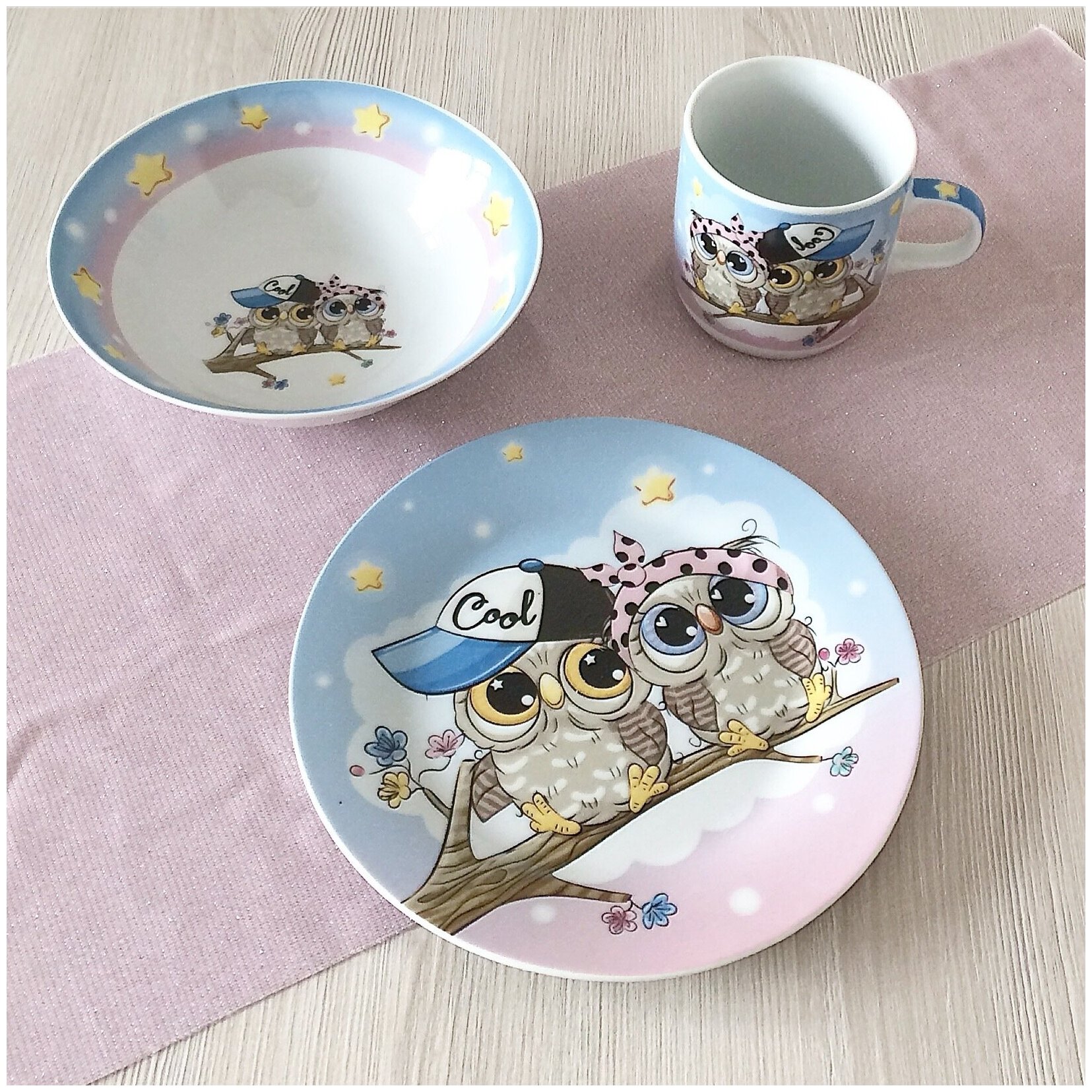Набор керамический детской посуды «Совы тинейджеры» 3 предмета: кружка 230 мл, миска 400 мл, тарелка 18 см
