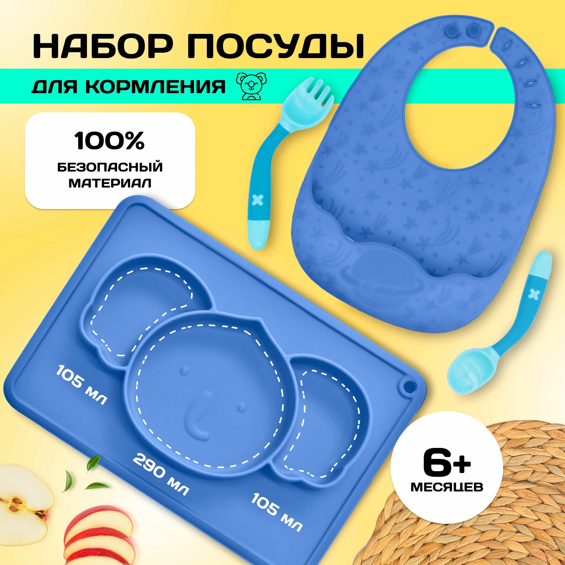 Купить Детская силиконовая секционная тарелка с вилкой, ложкой и слюнявчиком