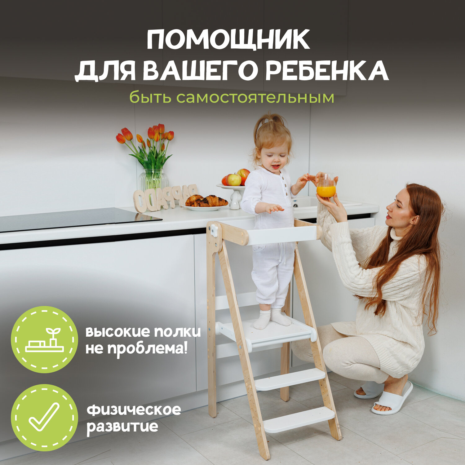 Башня помощника Монтессори "Комфорт" лакированная + доска для рисования мелом/ ограничитель PAPPADO стульчик для кормления