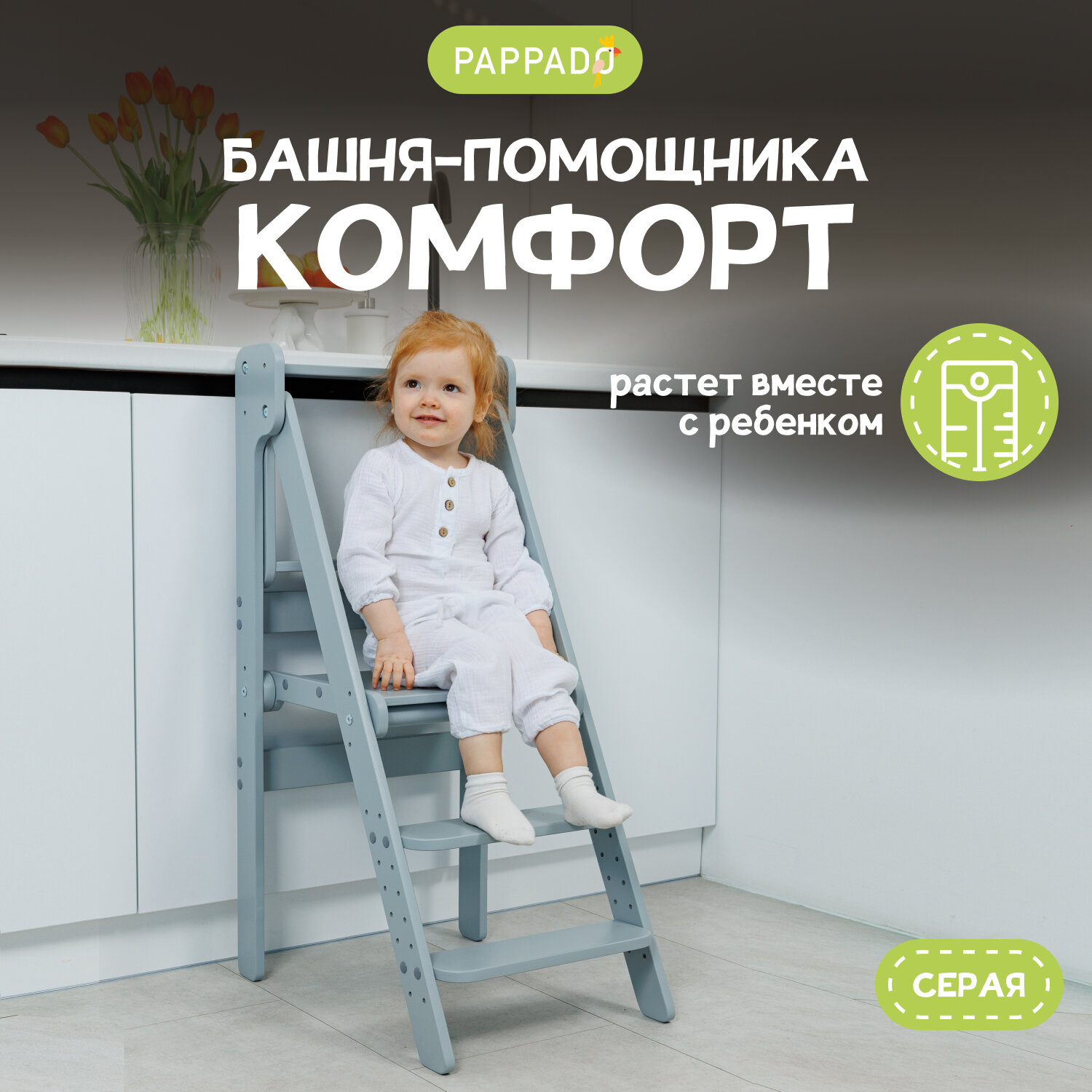 Башня помощника Монтессори "Комфорт" серо -белая + доска для рисования мелом/ ограничитель PAPPADO стульчик для кормления
