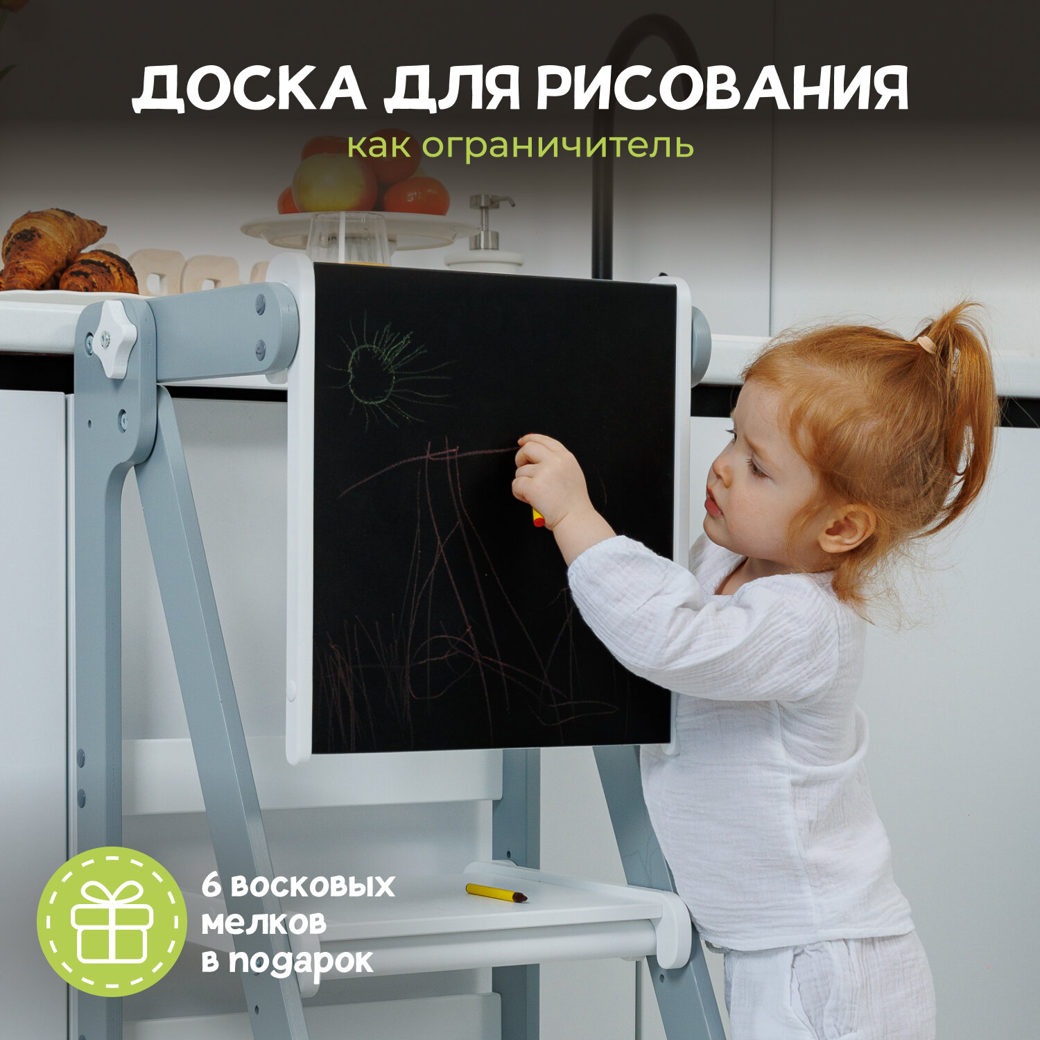 Башня помощника Монтессори "Комфорт" белая + доска для рисования мелом/ ограничитель PAPPADO стульчик для кормления