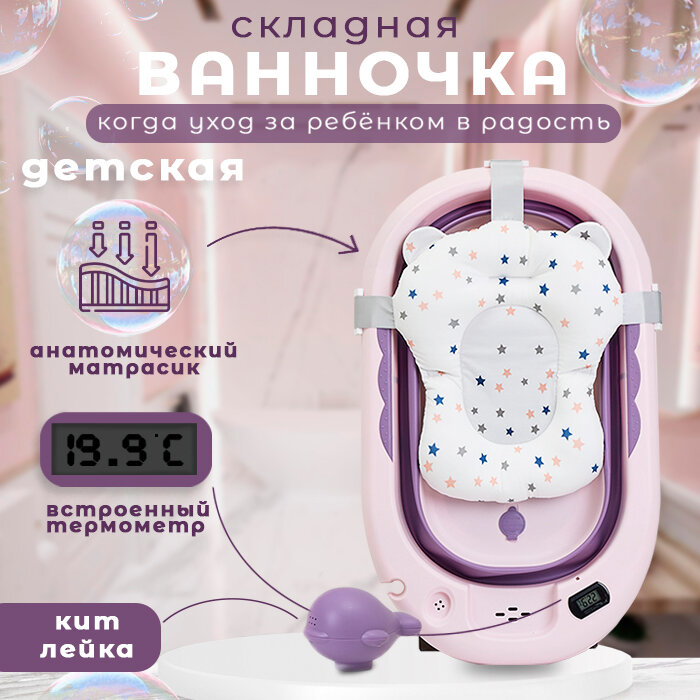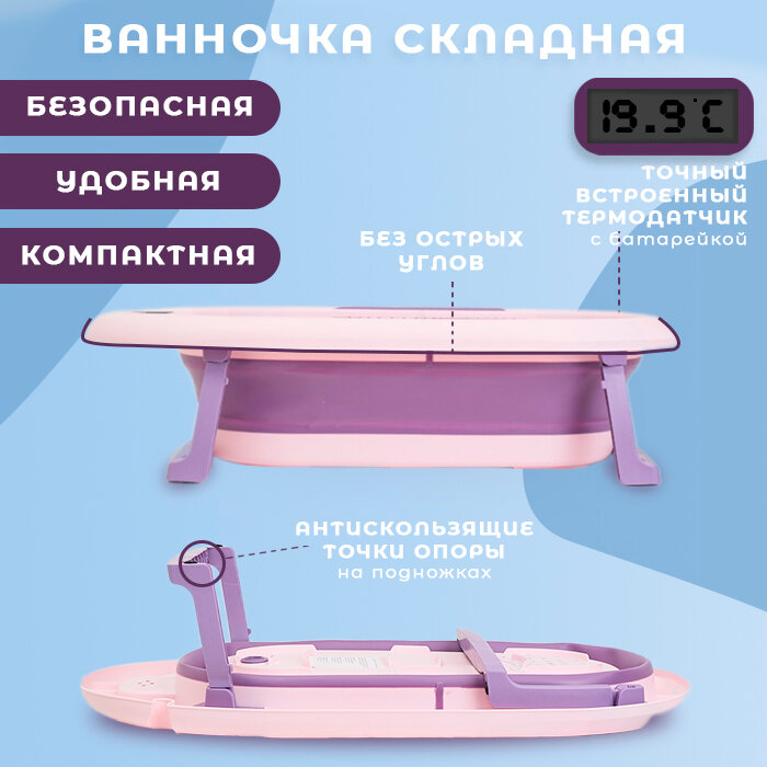 Детская ванночка Agex Aqua Purple, складная, термометр, матрас, ковш