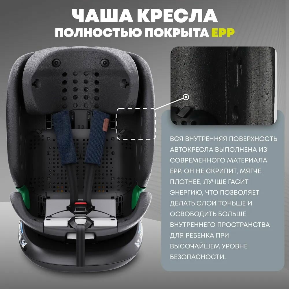 | Особенности | краш-тесты Германия, бесшумный поворотный механизм без люфта, пена с памятью формы в подголовниках, вкладыш для младецнев, мягкие энергопоглощающме EPP вставки в корпусе повышенной прочности, внешняя боковая защита SIP с гальваническим напылением металла, трансформация между группами без демонтажа ремешков |