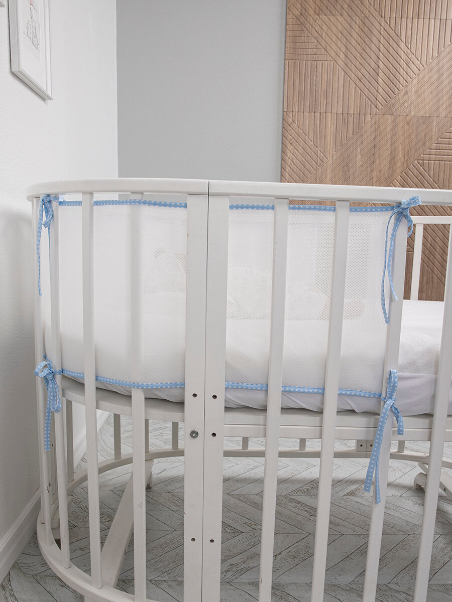 СохранитьБортики в кроватку для новорожденных сетка 31х180, на прямоугольную, круглую, овальную кровать, цвет голубой интересное: