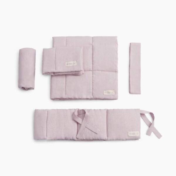 | Дополнительная информация | Комплект из 5 предметов: подушка 60х40 см, одеяло 100х100 см, простыня на резинке 100х70 см, бортики 157х22 см, лента 145х8 см - лен (текстиль). |