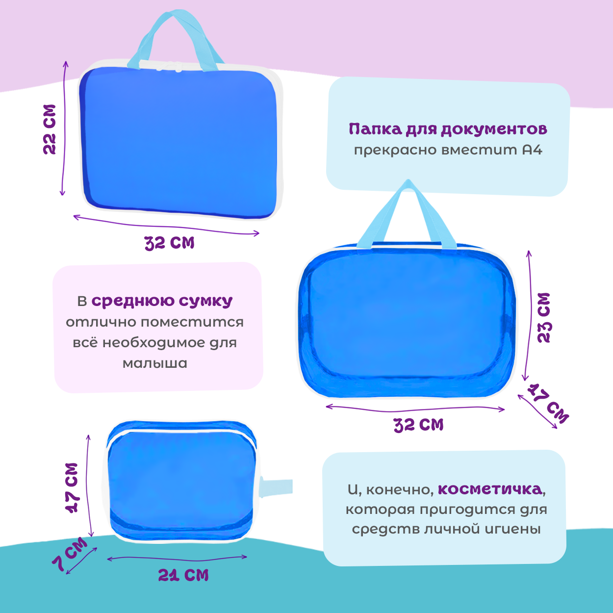 | Комплектация | Большая сумка (54 см х 33 см х 24 см) Средняя сумка для детских принадлежностей (32 см х 23 см х 17 см) Косметичка (21 см х 17 см х 7 см) Папка для документов (32 см х 22 см х 2 см) |