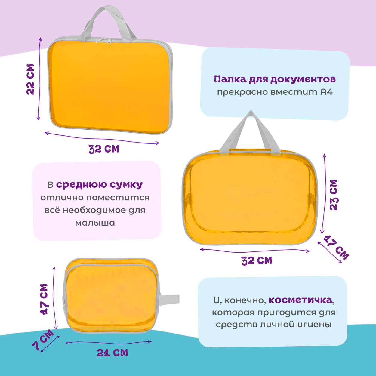 | Комплектация | Большая сумка (54 см х 33 см х 24 см) Средняя сумка для детских принадлежностей (32 см х 23 см х 17 см) Косметичка (21 см х 17 см х 7 см) Папка для документов (32 см х 22 см х 2 см) |