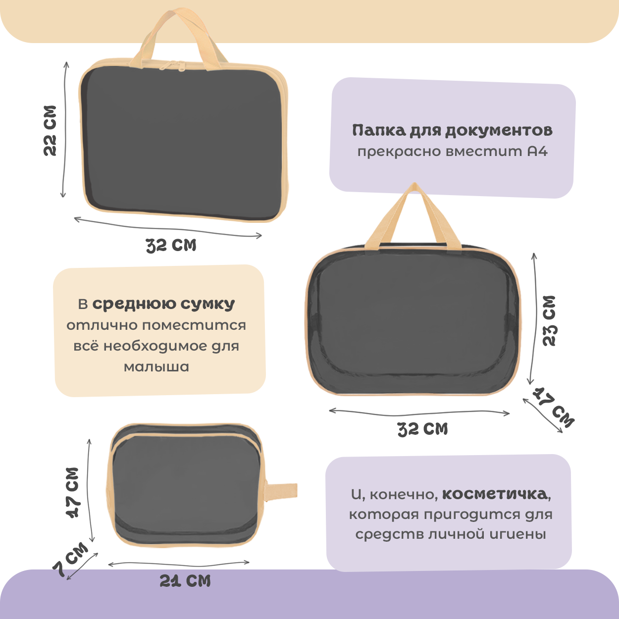 | Комплектация | Большая сумка (54 см х 33 см х 24 см) Средняя сумка для детских принадлежностей (32 см х 23 см х 17 см) Косметичка (21 см х 17 см х 7 см) Папка для документов (32 см х 22 см х 2 см) |