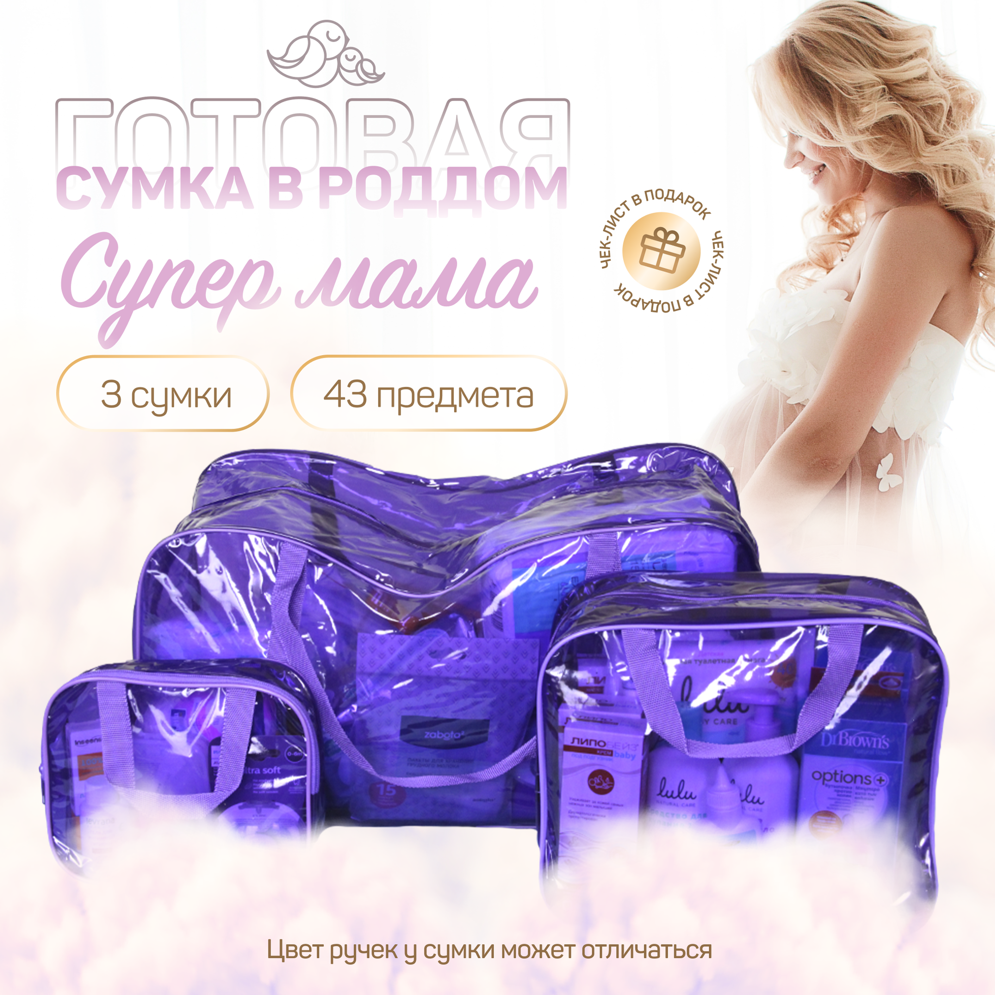 Купить Сумка в роддом готовая для мамы и малыша с наполнением, 43 предмета + 3 сумки, комплектация "Супер Мама", фиолетовая
