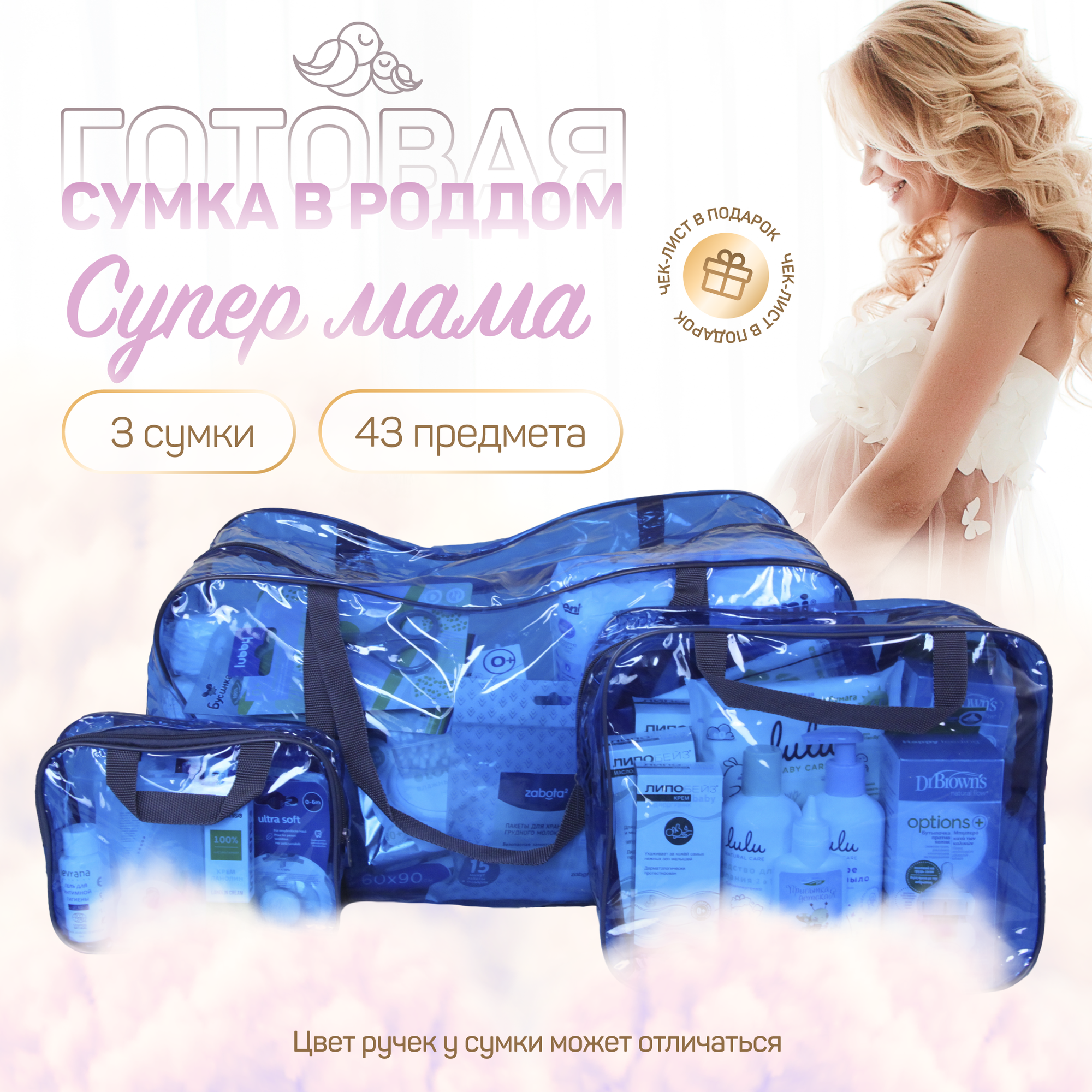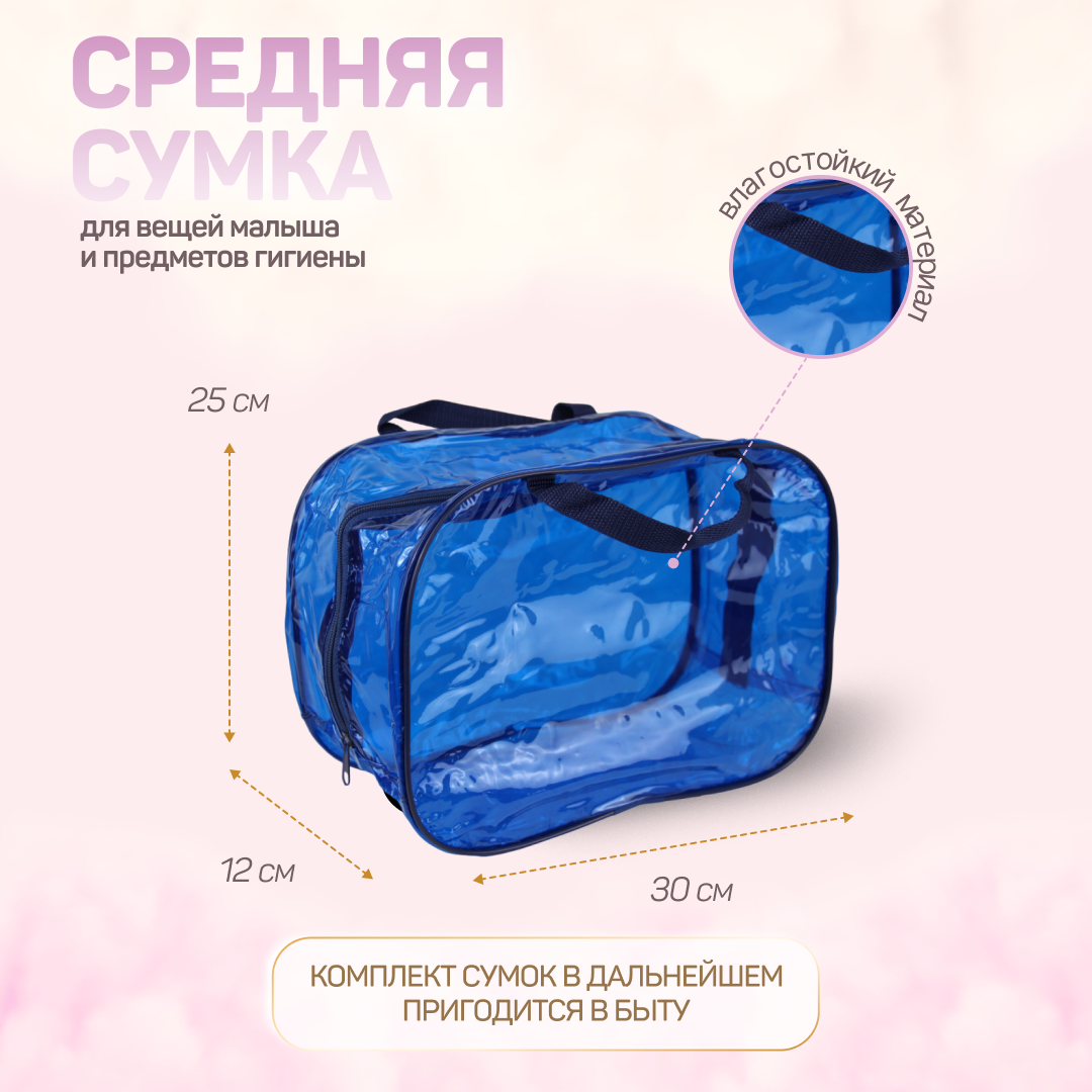 Сумка в роддом готовая для мамы и малыша с наполнением, 43 предмета + 3 сумки, комплектация "Супер Мама", прозрачная