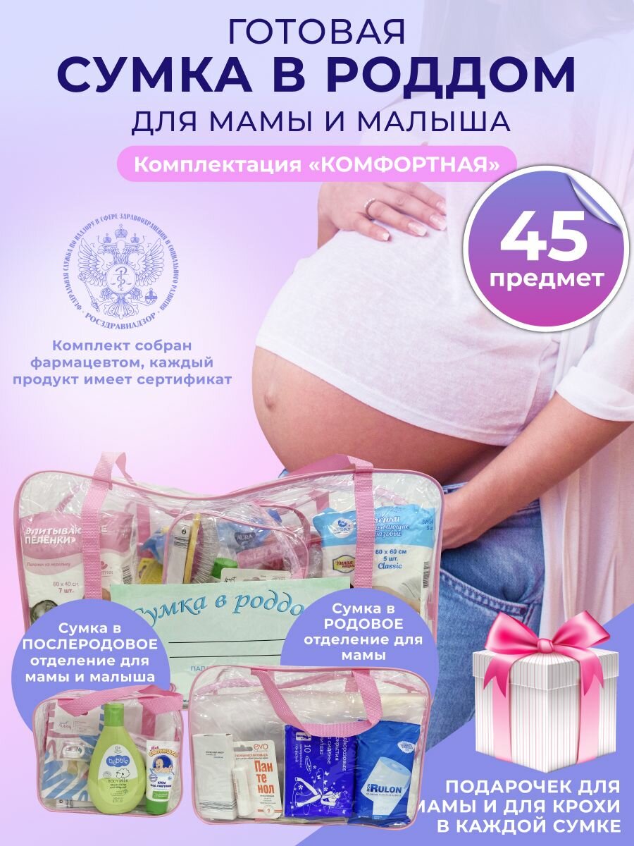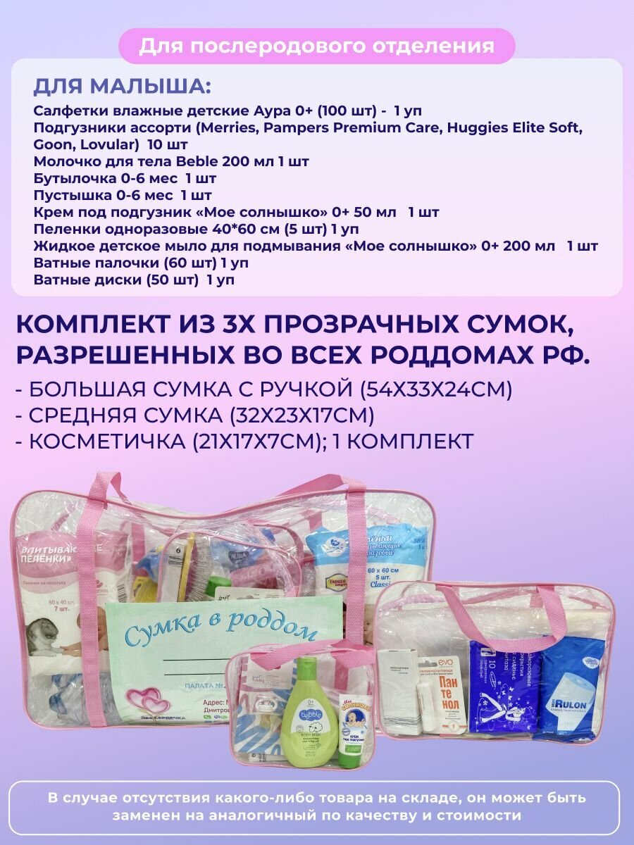 Cумка в роддом прозрачная готовая для мамы и малыша набор для беременных комплектация "Комфортная", цвет розовый прозрачный интересное: