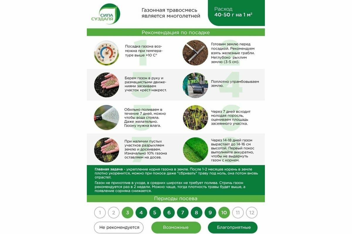 | Трава | горчица / лен / мятлик / овсяница / овсяница красная / овсяница луговая / райграс / райграс многолетний / тимофеевка / фацелия / фестулолиум |