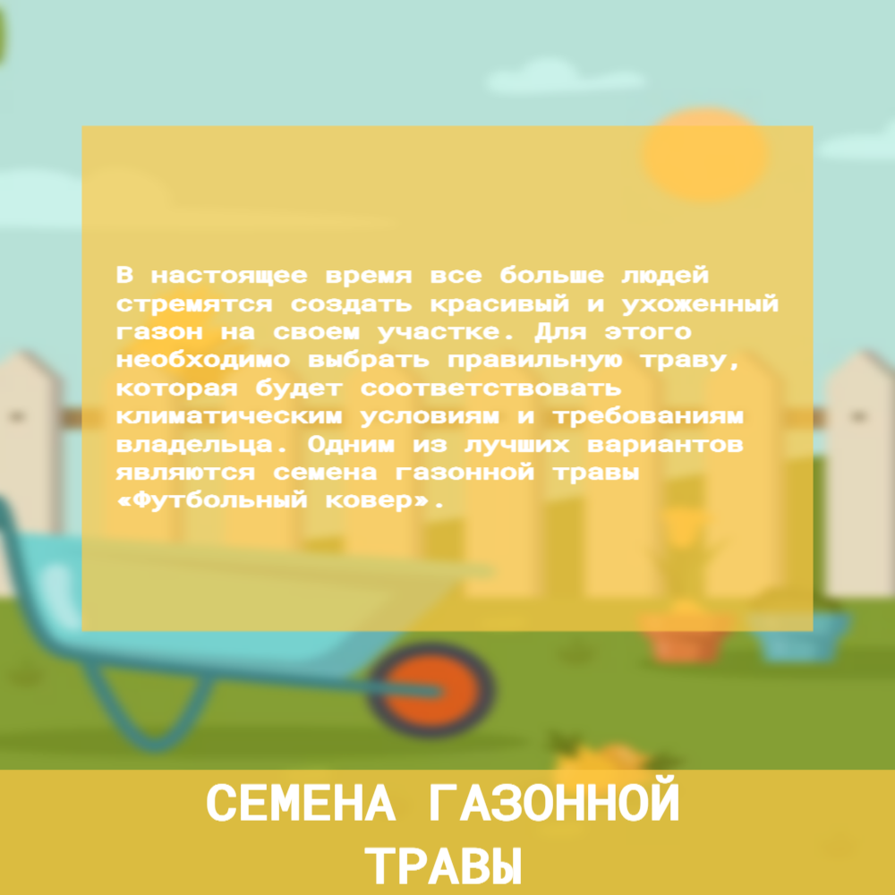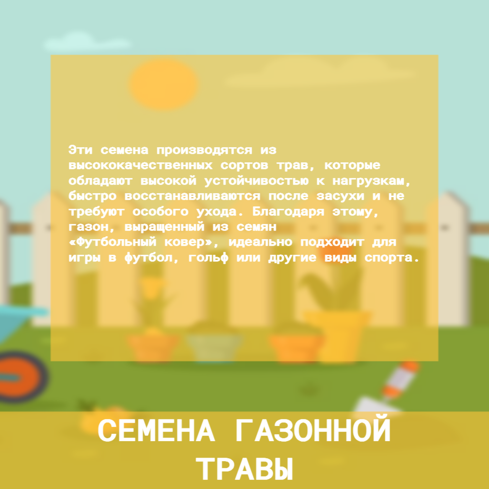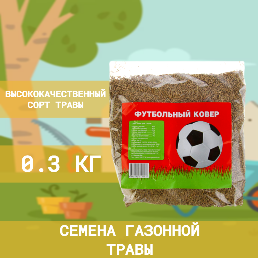 | Дополнительная информация | травосместь Футбольный ковер предназначена для создания опрятного и устойчивого газона как на открытых участках, так и умеренно затененных |