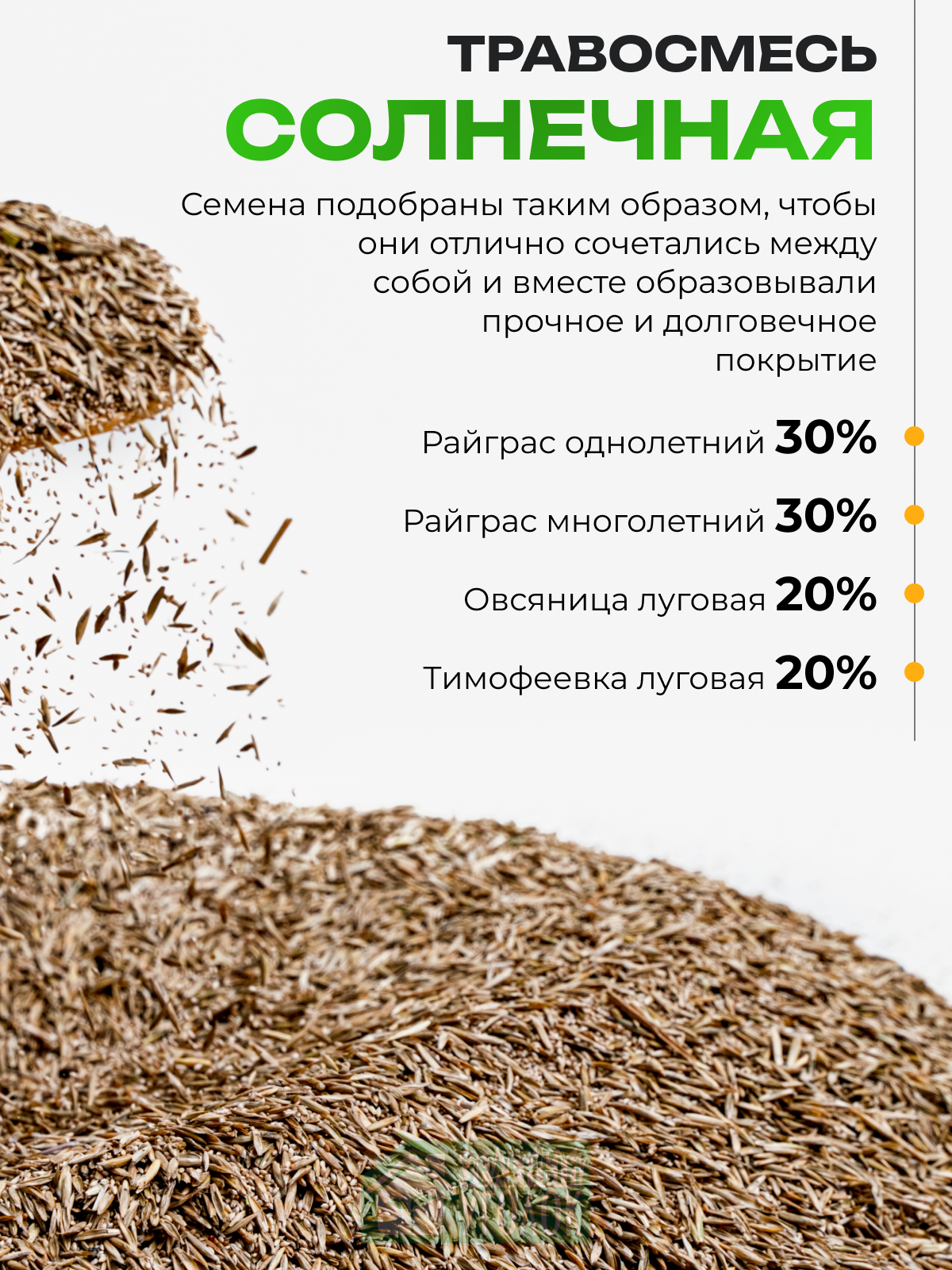 | Дополнительная информация | ГОСТ Р52325-2005; высота скашивания 4-8 см; семена можно сеять с весны по осень: оптимально выбрать теплую, не жаркую погоду |