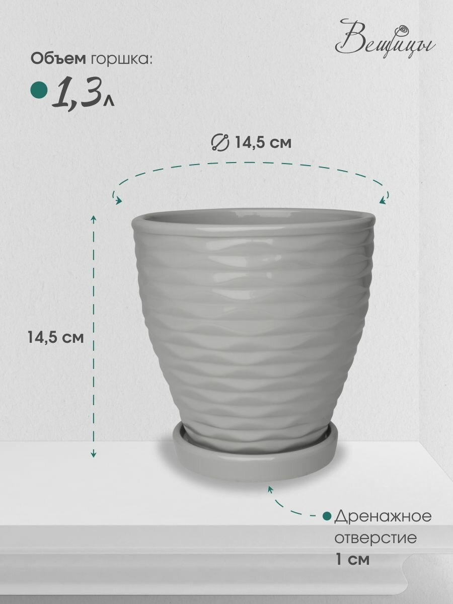 Вещицы Горшок для цветов с поддоном керамический 1,35 литра серый Fdtc8