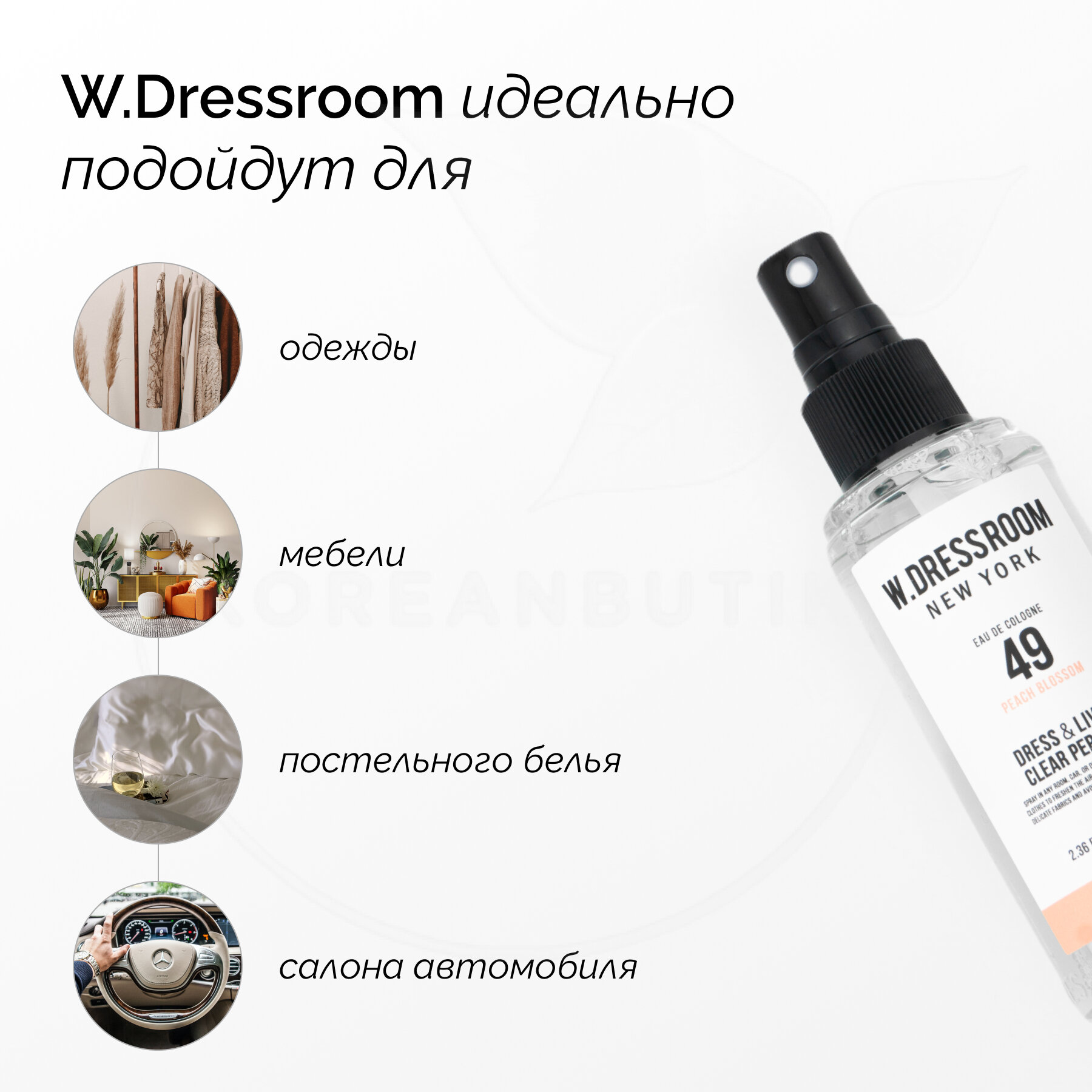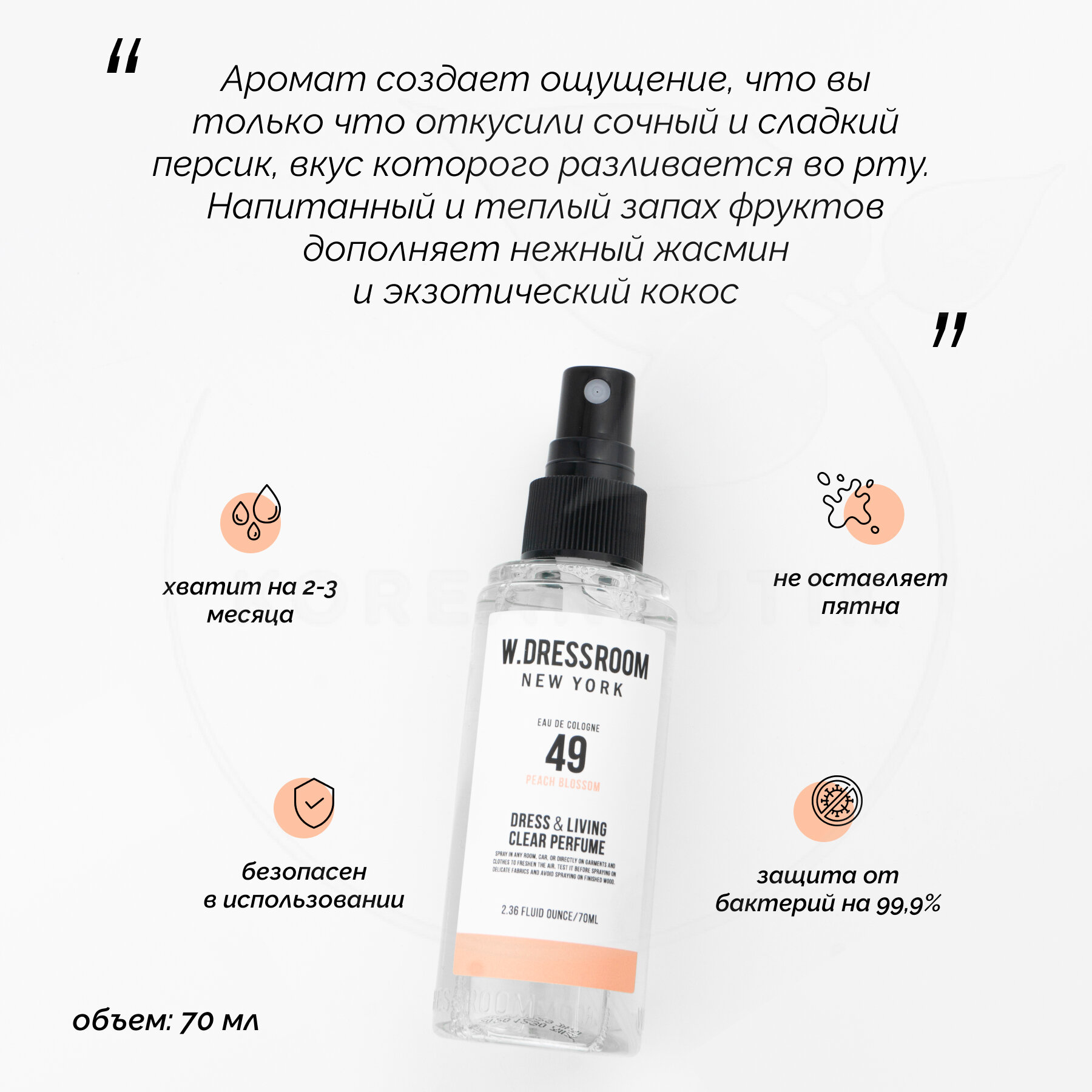 Парфюмированный спрей Dress & Living Clear Perfume No.49 Peach Blossom 70 ml W.Dressroom/ Спрей для одежды/ BTS интересное: