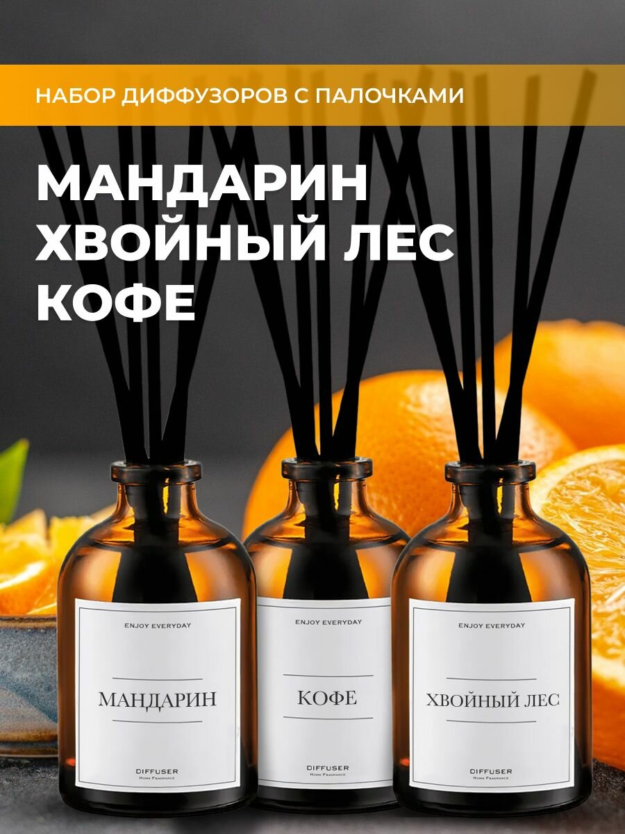 Купить Набор ароматических диффузоров Хвойный лес + Мандарин + Кофе/ ароматизатор для дома с палочками 3 шт