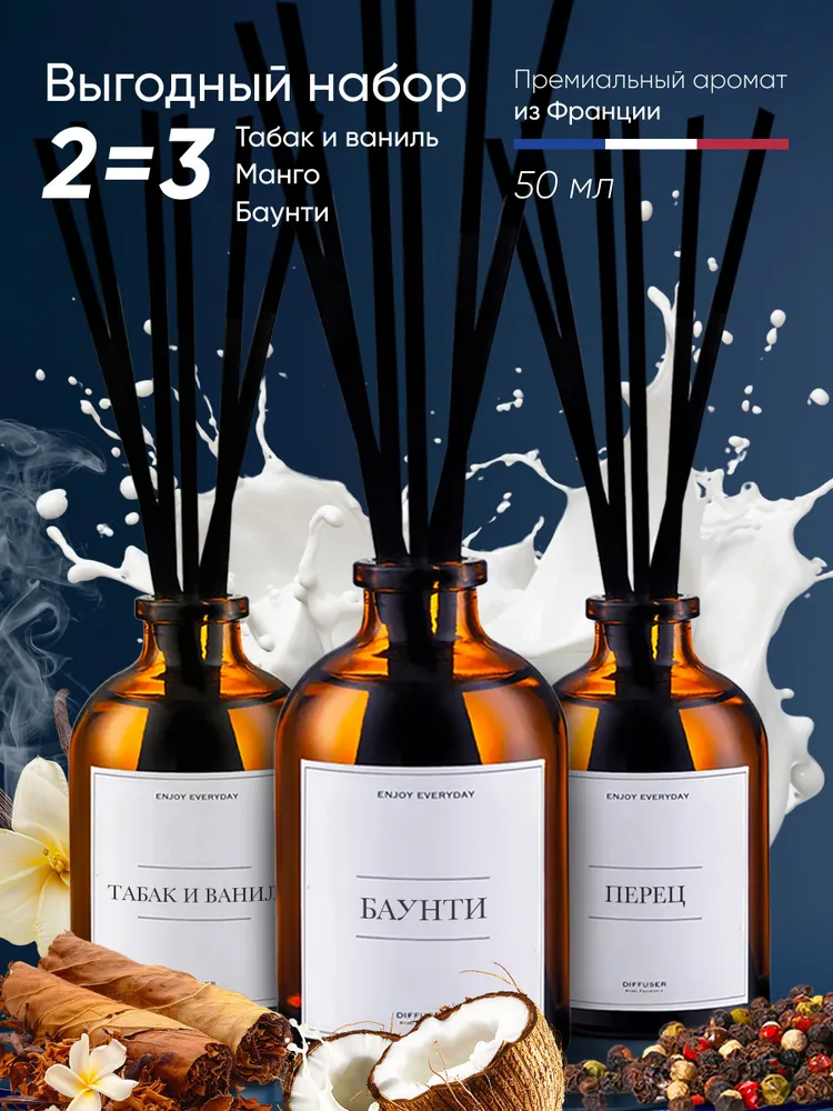 Купить Набор ароматических диффузоров Черный перец + Баунти + Табак и ваниль/ ароматизатор для дома с палочками 3 шт