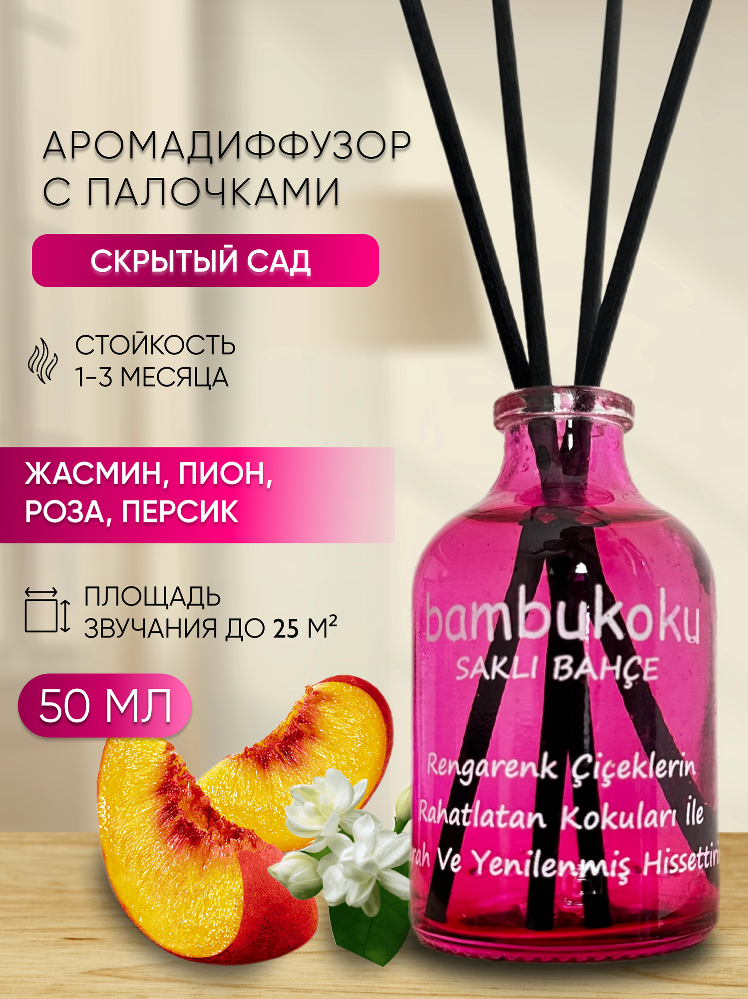 Ароматизатор для дома парфюм, диффузор с палочками Персик 50 мл