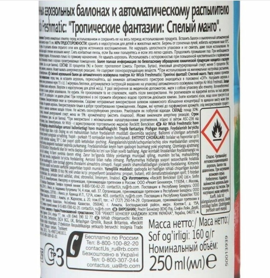 | Дополнительная информация | баллон для автоматического освежителя воздуха Air Wick Freshmatic; перед тем, как вставить аэрозоль, проверьте, что диспенсер выключен; не направляйте в лицо при включении или при установке интервала распыления; после включения распыление начнется автоматически через 15 сек |
