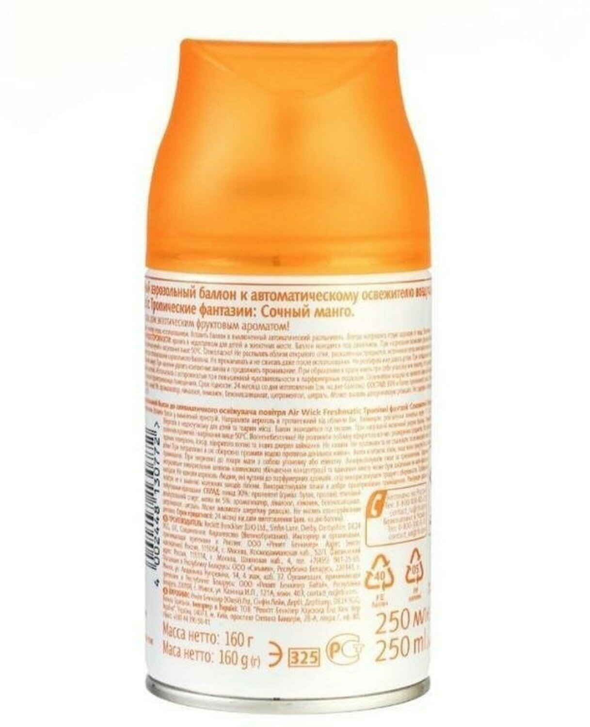 | Дополнительная информация | баллон для автоматического освежителя воздуха Air Wick Freshmatic; перед тем, как вставить аэрозоль, проверьте, что диспенсер выключен; не направляйте в лицо при включении или при установке интервала распыления; после включения распыление начнется автоматически через 15 сек |