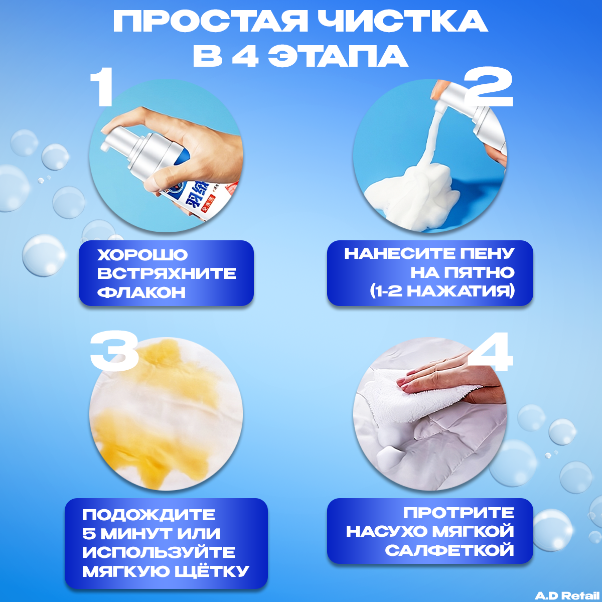 | Способ применения | Встряхните флакон, нанесите пену на загрязнение, оставьте на 1 минуту, зачистите щёткой загрязнение, остатки средства удалите чистой влажной салфеткой. Просушите изделие до полного высыхания. Если образовался развод, удалите контур развода чистой влажной тряпочкой. При необходимости повторите процедуру |