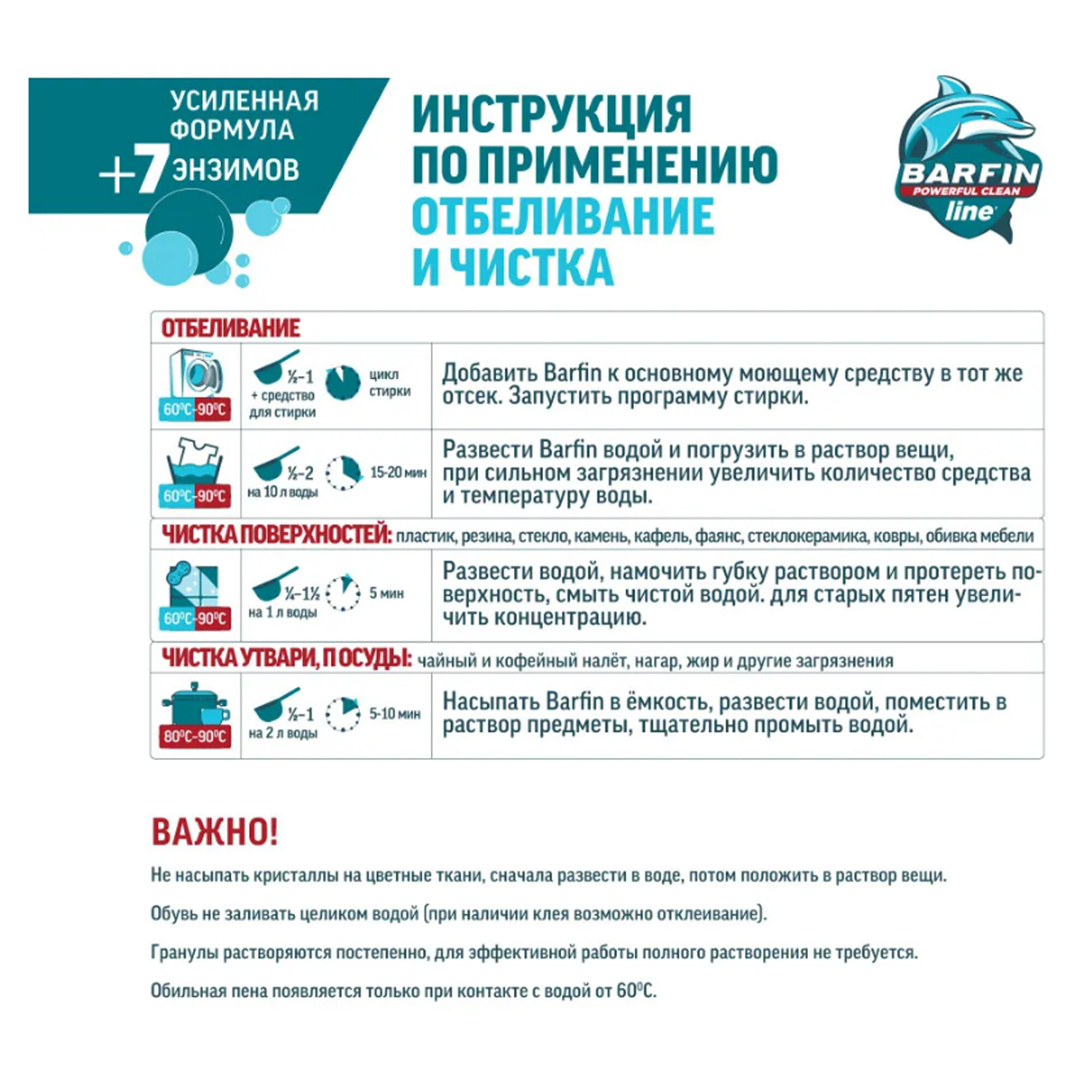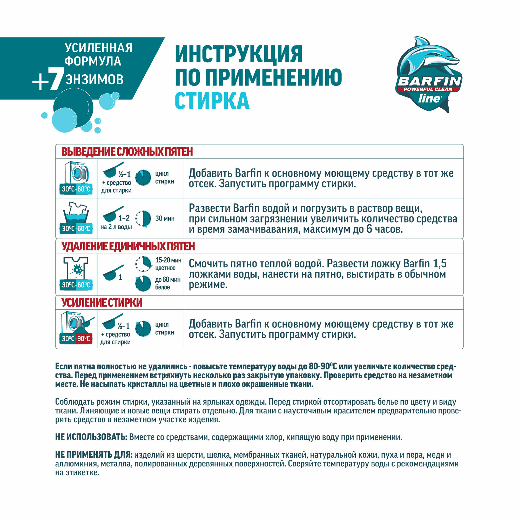 | Способ применения | Важно! Перед применением встряхнуть несколько раз закрытую упаковку. Соблюдать режим стирки, указанный на ярлыках одежды. Проверить средство на незаметном месте. Перед стиркой отсортировать бельё по цвету и виду ткани. Линяющие и новые вещи стирать отдельно. Для ткани с неустойчивым красителем предварительно проверить средство в незаметном участке изделия. |