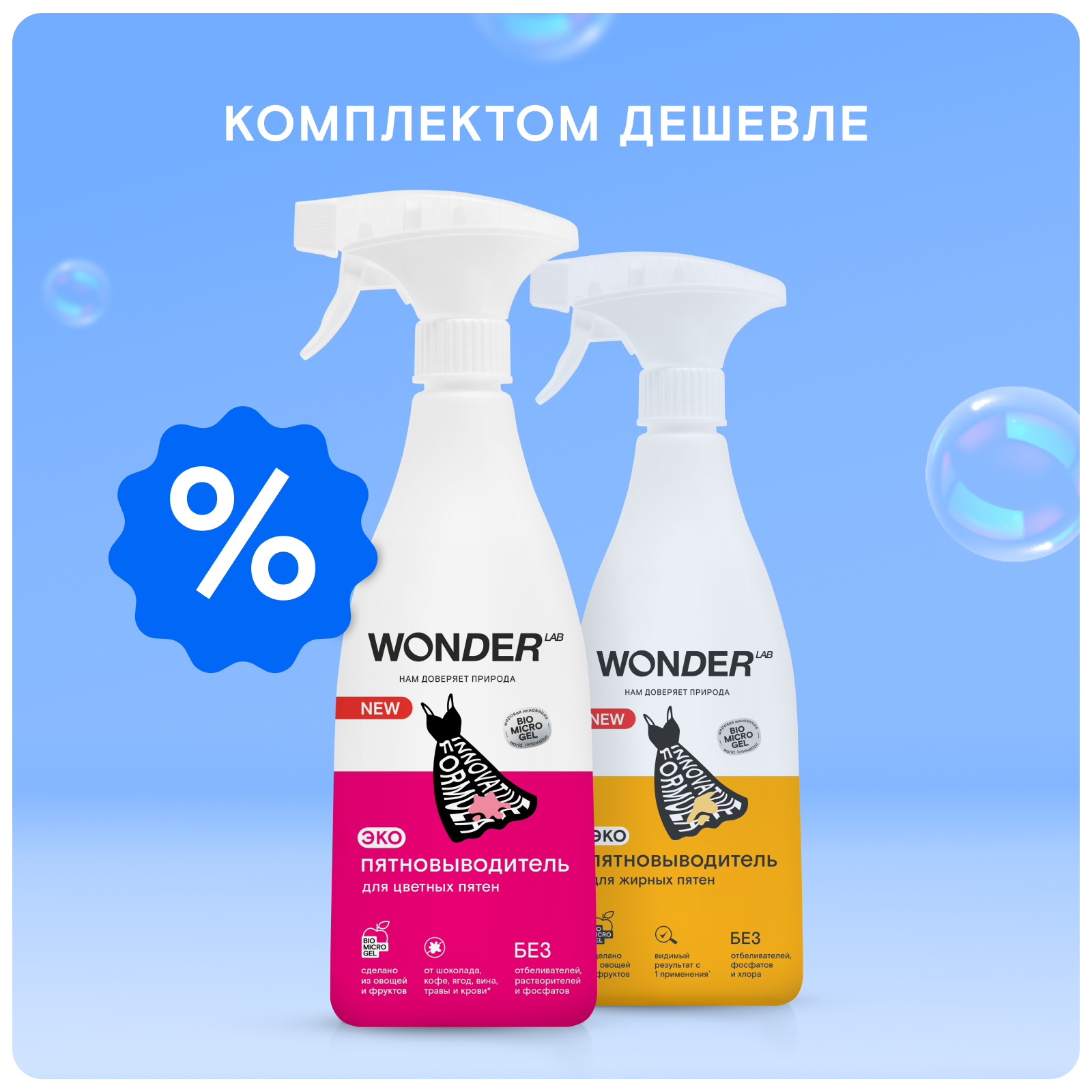 Купить Набор пятновыводителей для цветных и жирных пятен WONDER LAB для вещей и детского белья, 2х0,55 л