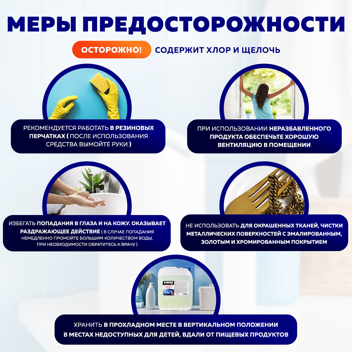 | Состав | Очищенная вода, 5% или более, но менее 15% гипохлорита натрия, анионные ПАВ < 5%, щелочь < 5% |