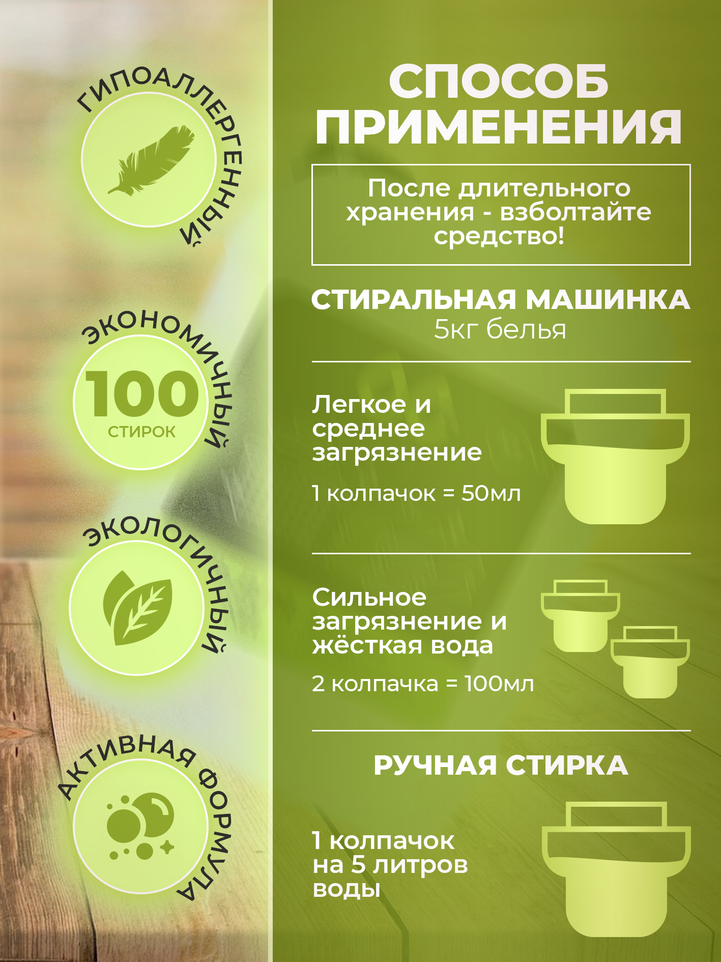 | Особенности | антибактериальное / безопасно для детей / безопасно для животных / биоразлагаемое / гипоаллергенное / концентрат / подходит для чувствительной кожи / стирка при любой температуре |