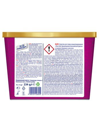 | Содержит | ПАВ / антибактериальный компонент / кондиционер / консерванты / пятновыводитель / фосфонат / энзимы |