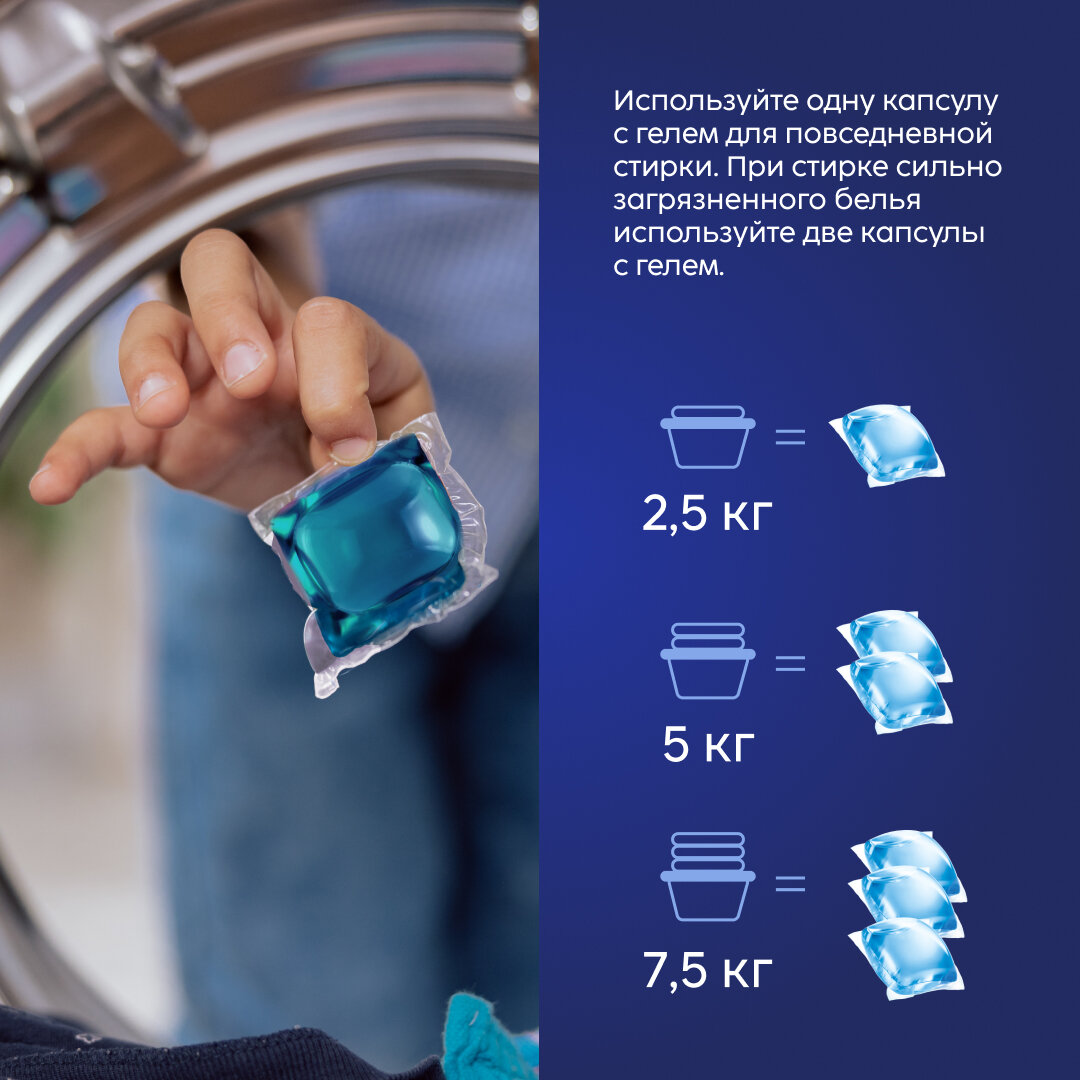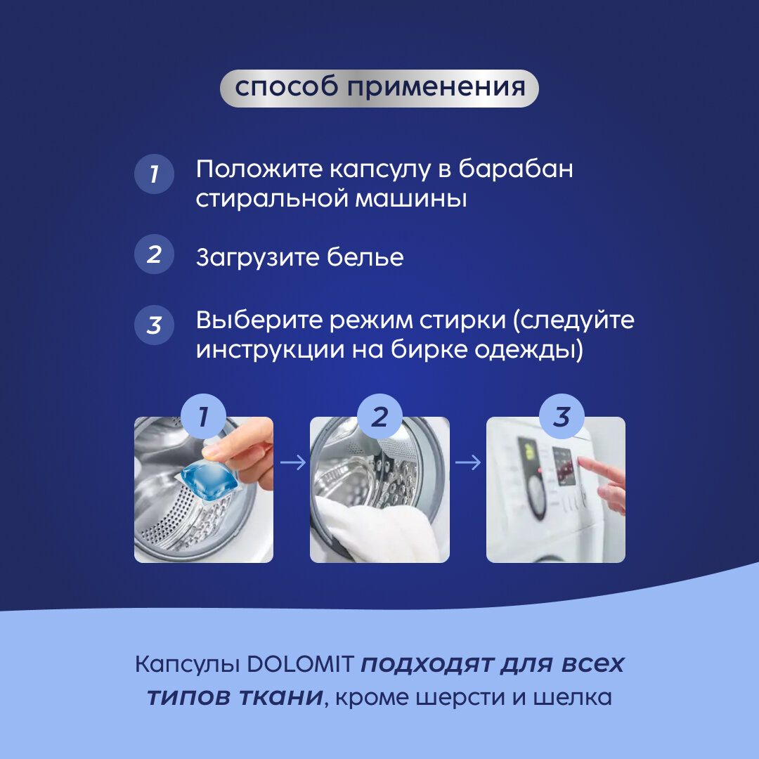 | Способ применения | Положите капсулу в барабан стиральной машины, загрузите белье, выберите режим стирки ( следуйте инструкции на бирке одежды) |