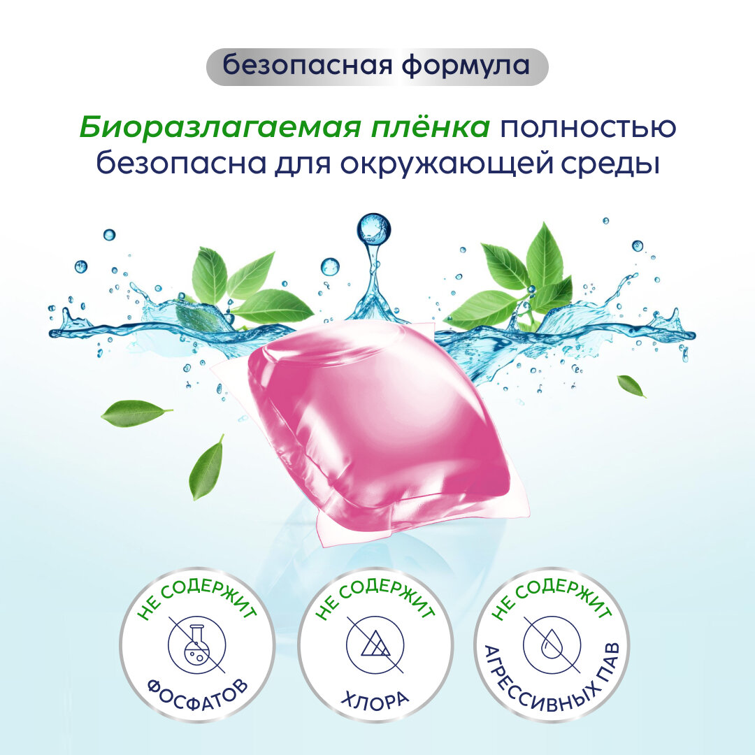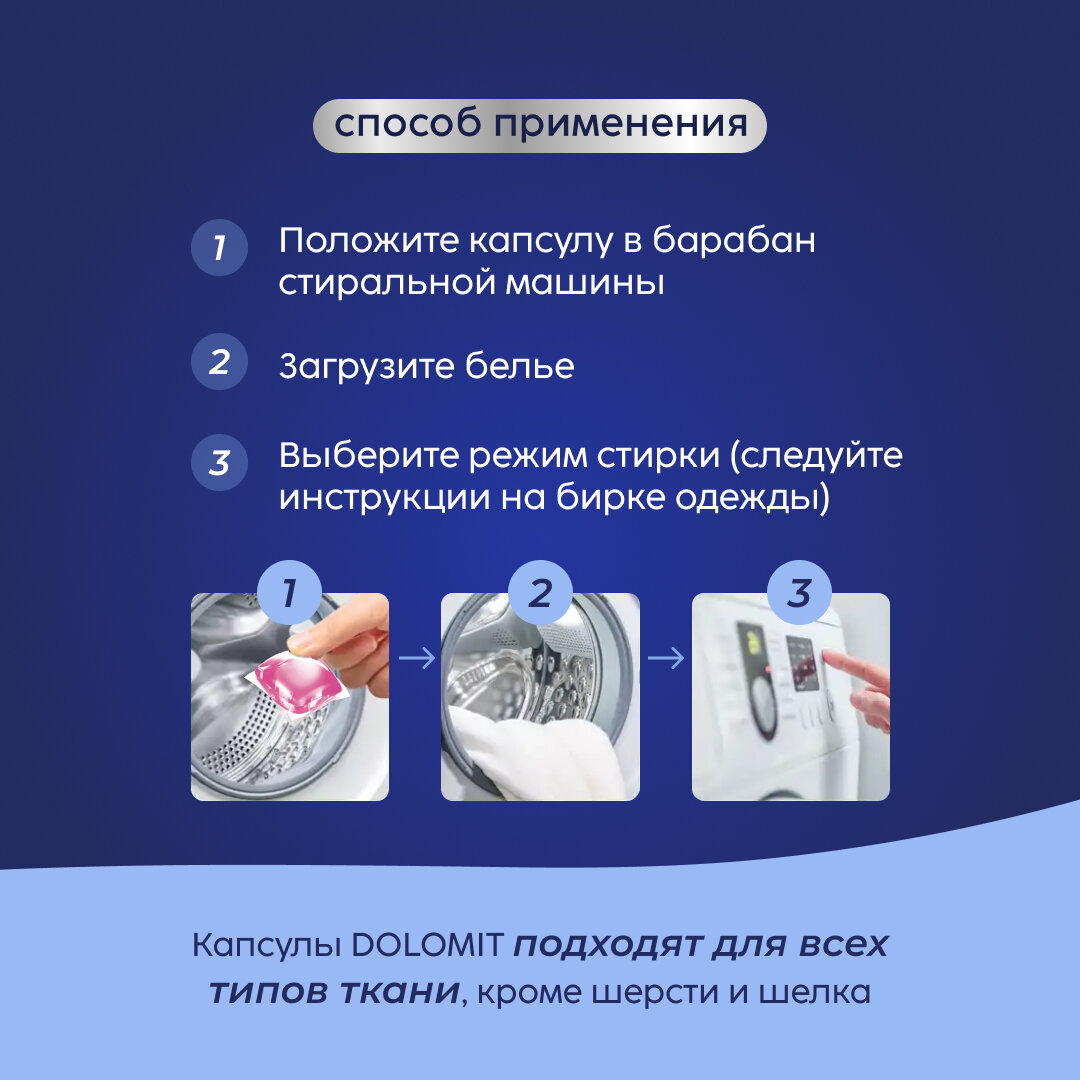 | Способ применения | Положите капсулу в барабан стиральной машины, загрузите белье, выберите режим стирки ( следуйте инструкции на бирке одежды) |